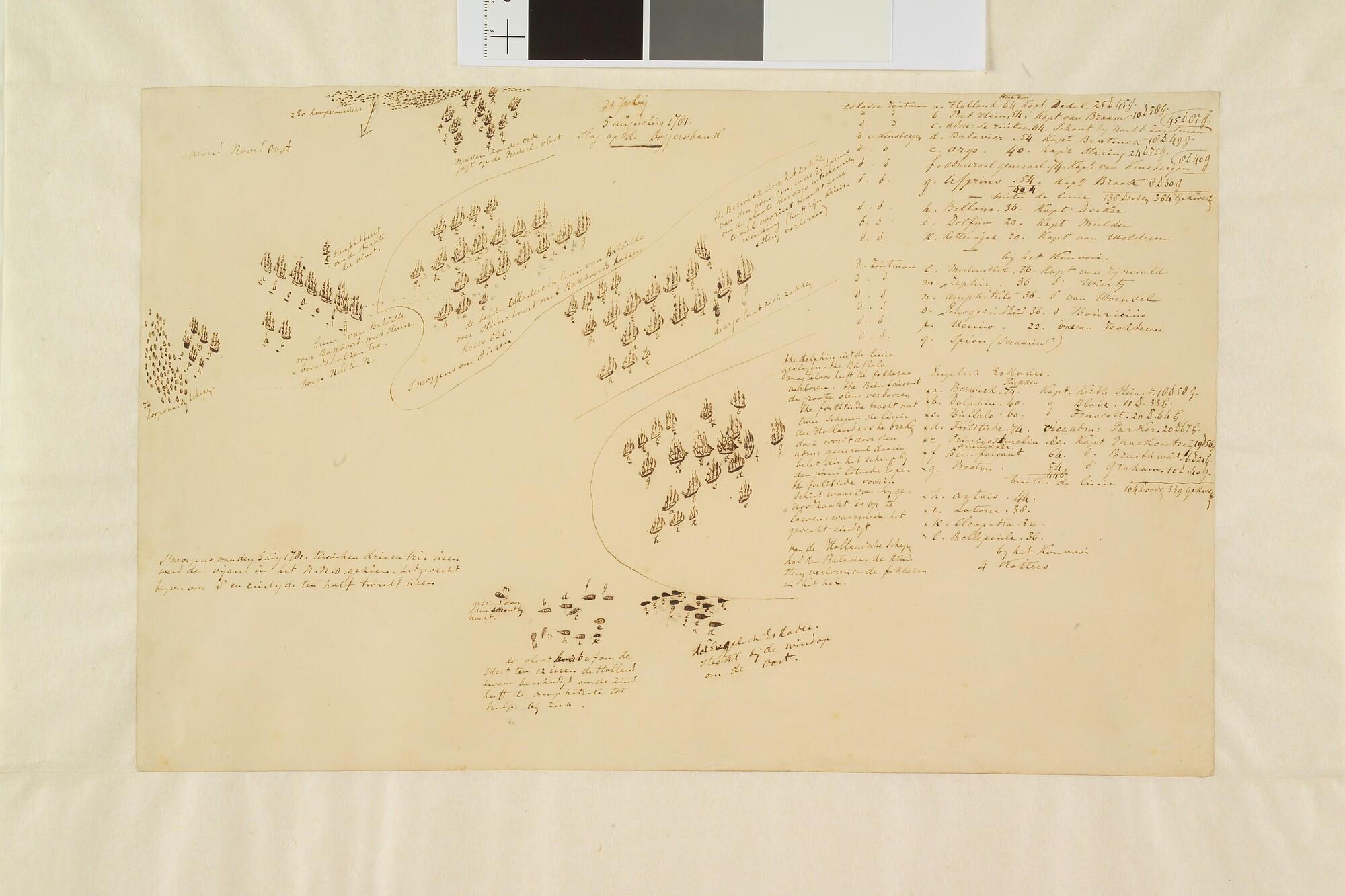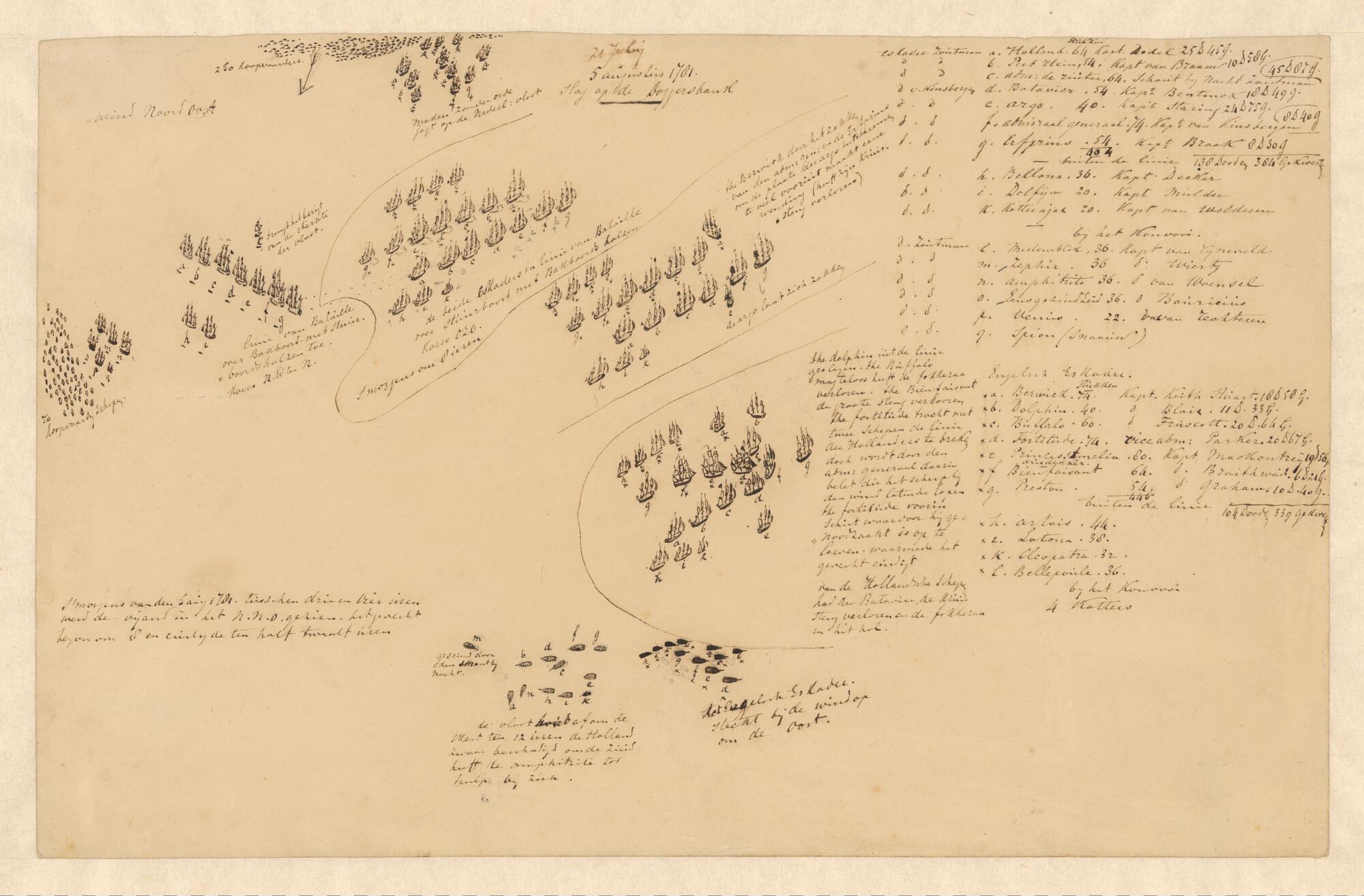 Situatie van de Hollandse en Engelse vloot tijdens de slag bij de Doggersbank op 5 augustus 1781, situatie in de vroege ochtend van 5 augustus 1781.