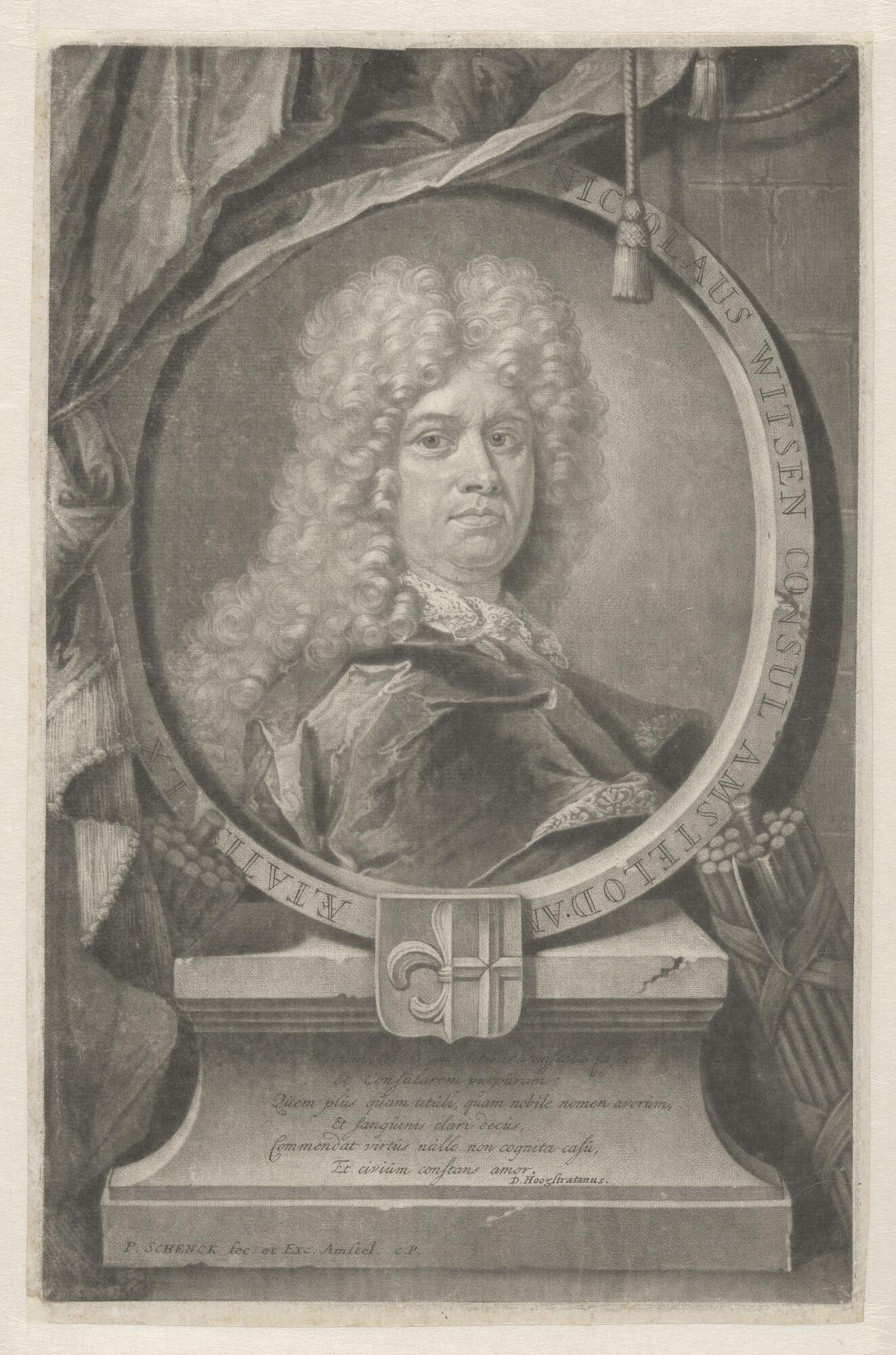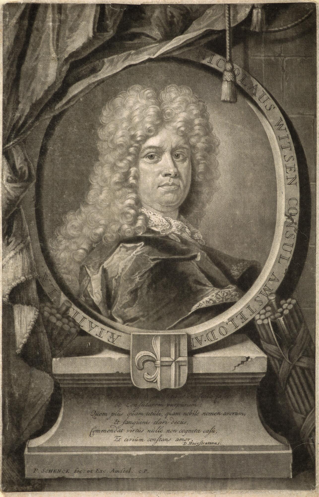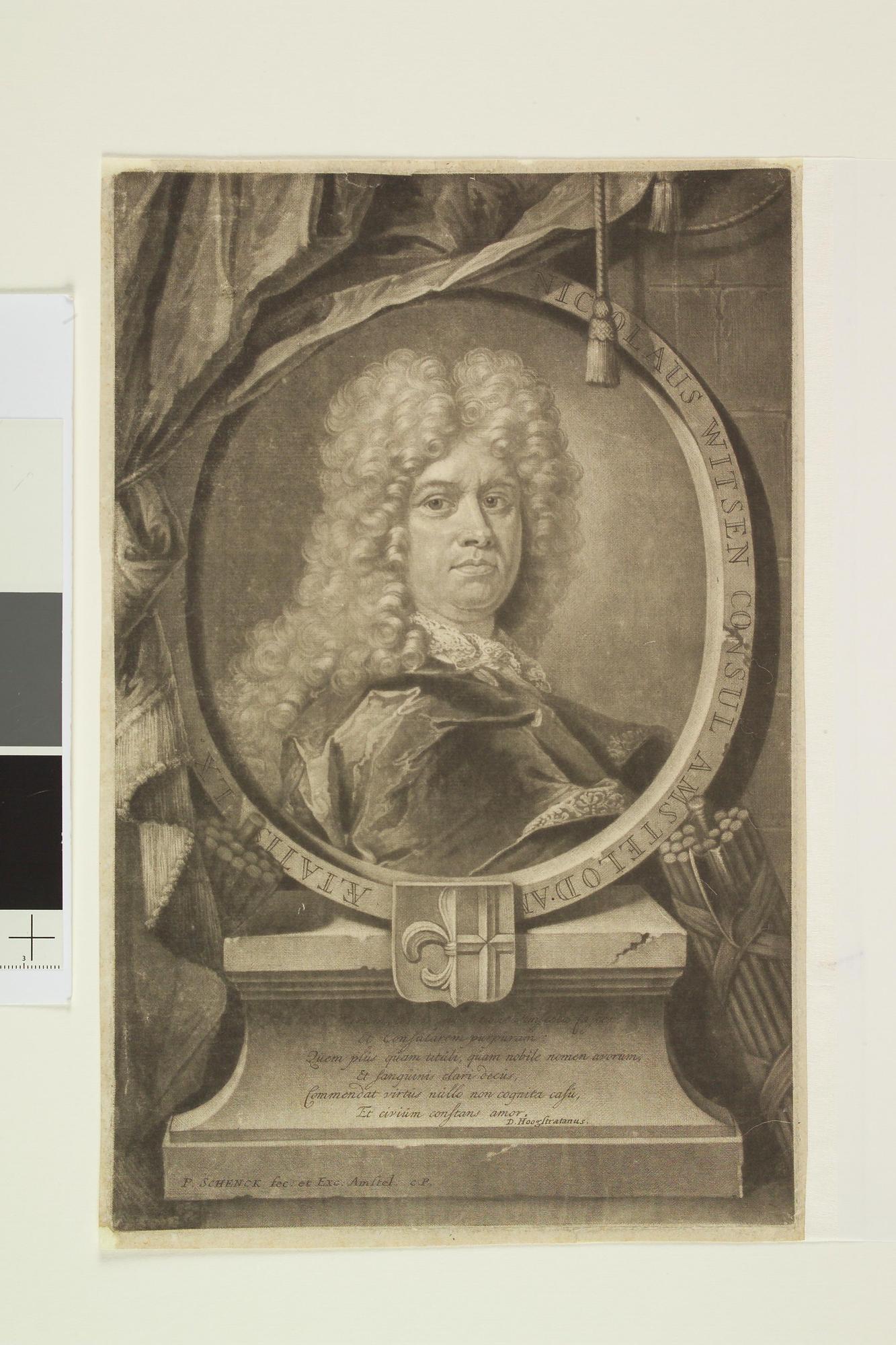 Portret van Nicolaas Witsen in ovaal met wapen.