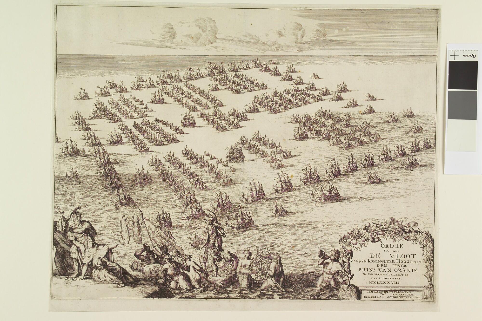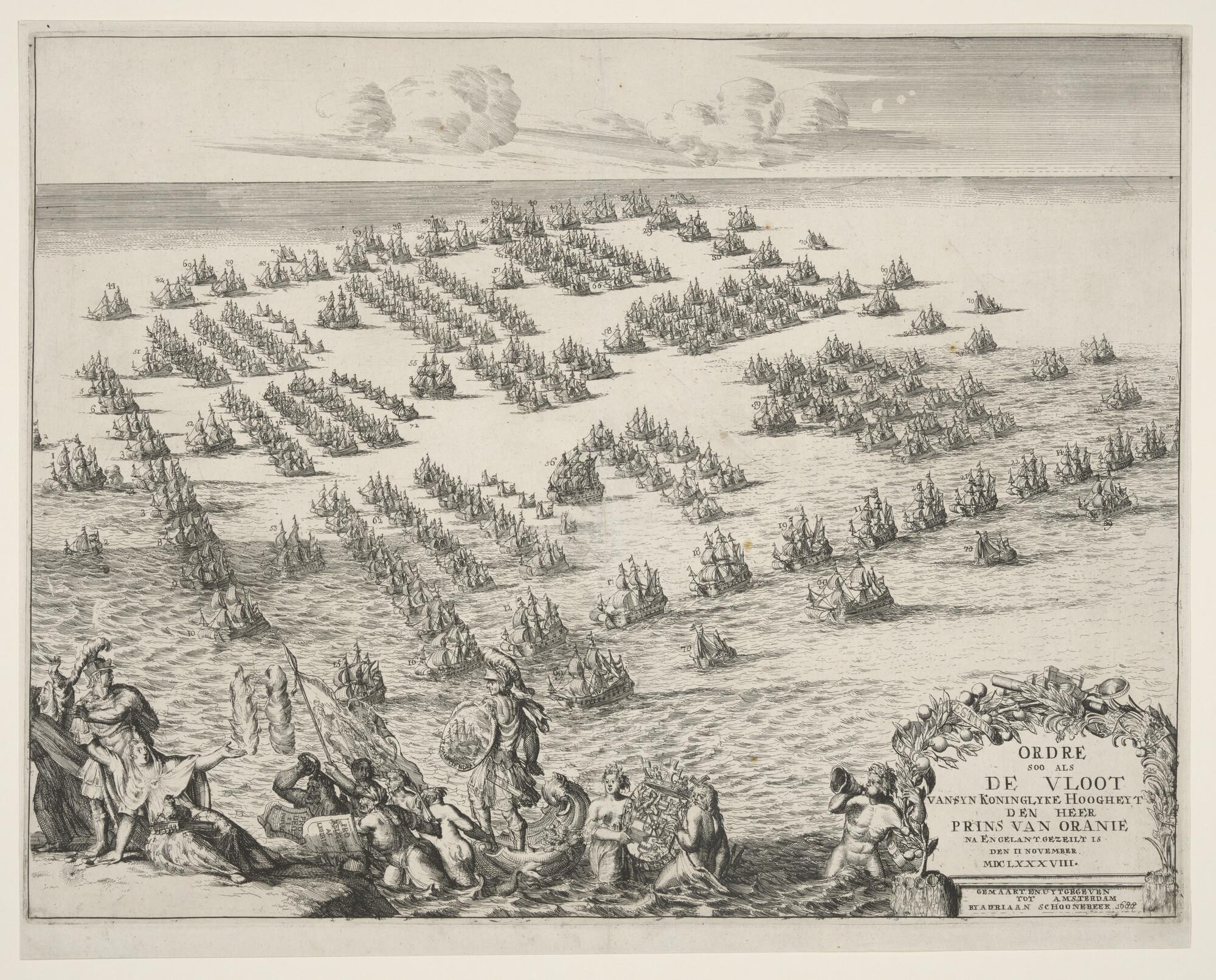 De vloot van de Prins van Oranje in zee in drie schuins liggende eskaders met onderaan enig zinnebeeldige figuren