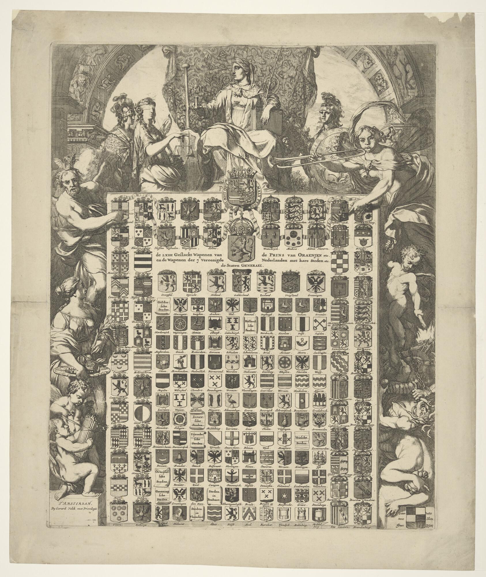 Een vlaggenkaart met 64 geslachtswapens, o.a. van de Prins van Oranje en de provincie- en gemeentewapens van de Zeven Verenigde Nederlanden, omlijst door een allegorische afbeelding van de Nederlandse maagd vergezeld door verschillende goden.