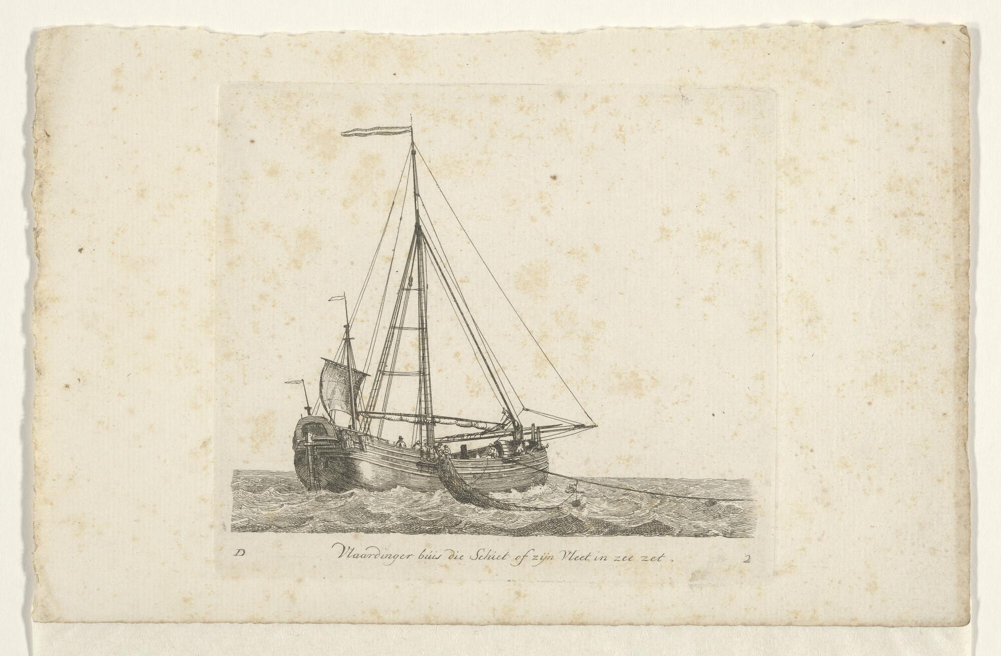 'Verscheidende Soorten van Hollandse Schepen' 4de catern, de vissers, nummer 2: een Vlaardinger buis die schiet of zijn vleet in zee zet.