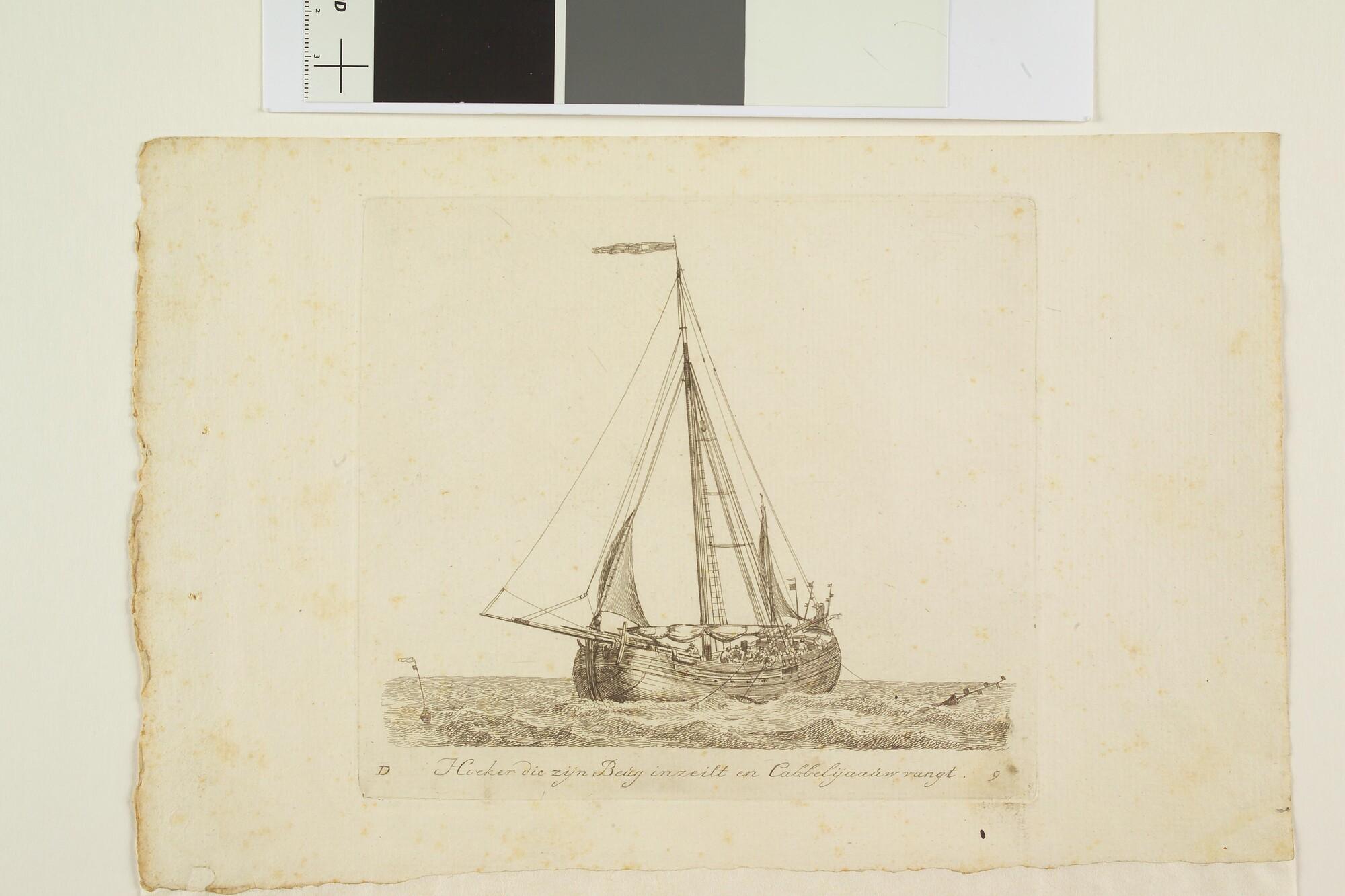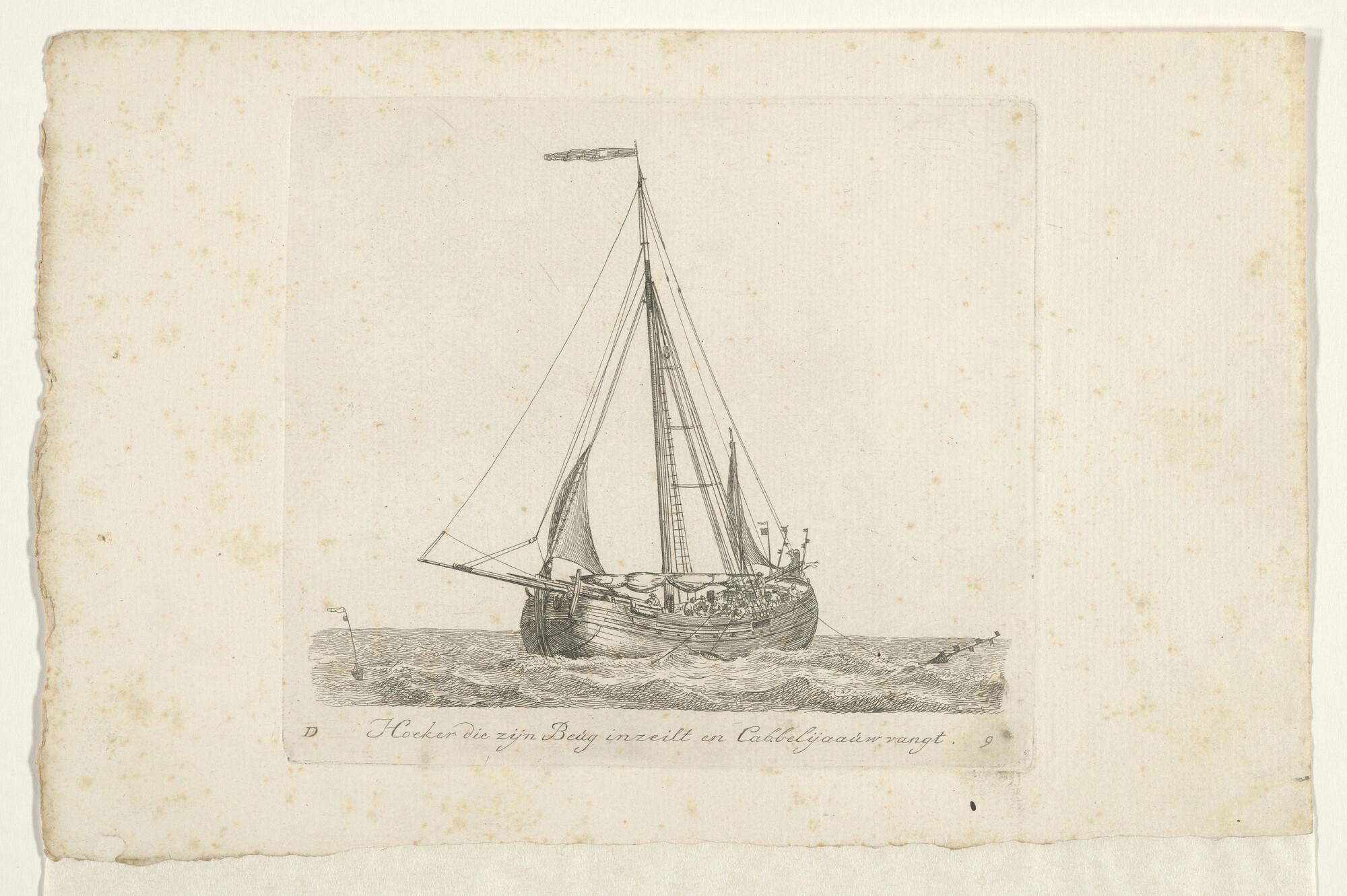 'Verscheidende Soorten van Hollandse Schepen' 4de catern, de vissers, nummer 9: hoeker die zijn beug inzeilt en kabbeljauw vangt.