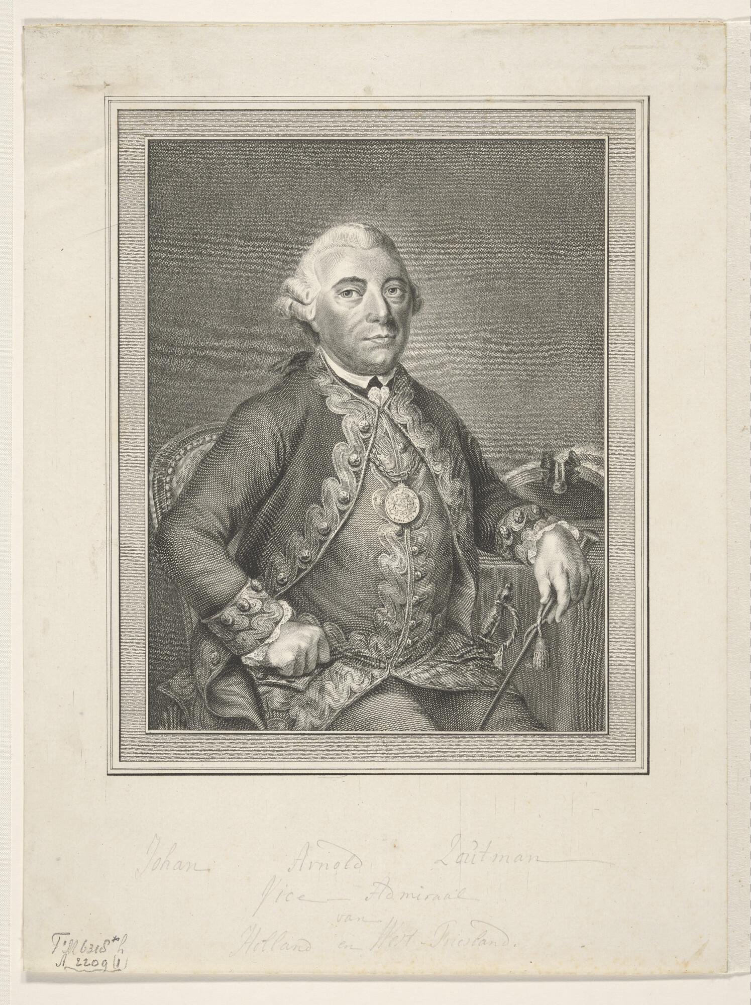 Portret van Johan Arnold Zoutman, zittend aan een tafel, met een wandelstok in de hand.