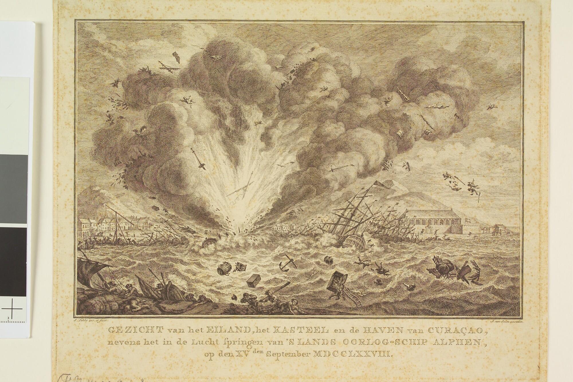 Het in de lucht springen van het oorlogsschip "Alphen" in de haven van Curaçao.