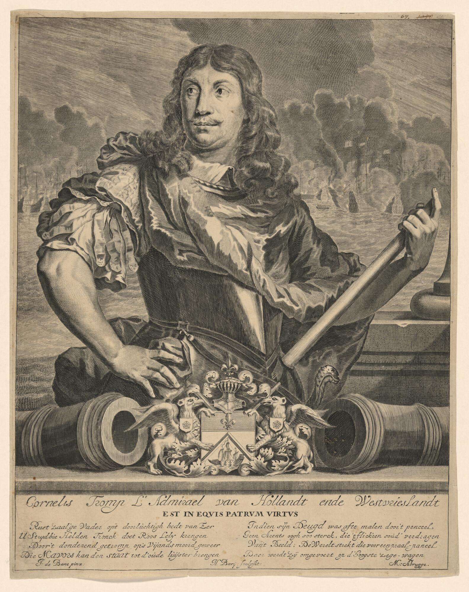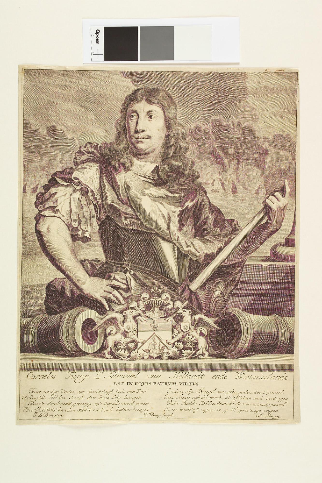 Portret van Cornelis Tromp, luitenant-admiraal van Holland, in zijn hand een commandostaf; op de achtergrond een zeeslag. Onder het portret een familiewapen, geflankeerd door twee kanonnen, daaronder een 8-regelig gedicht.