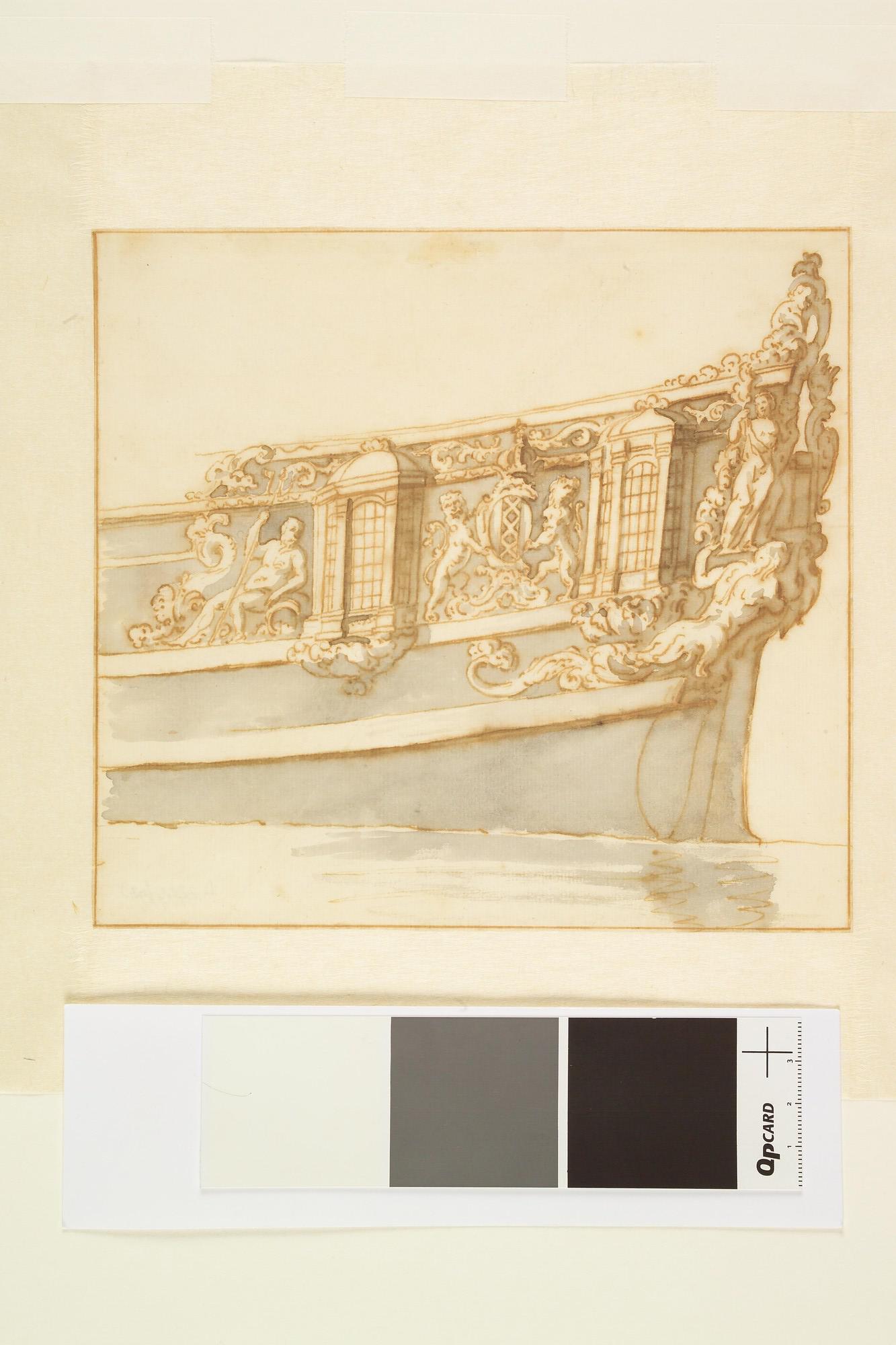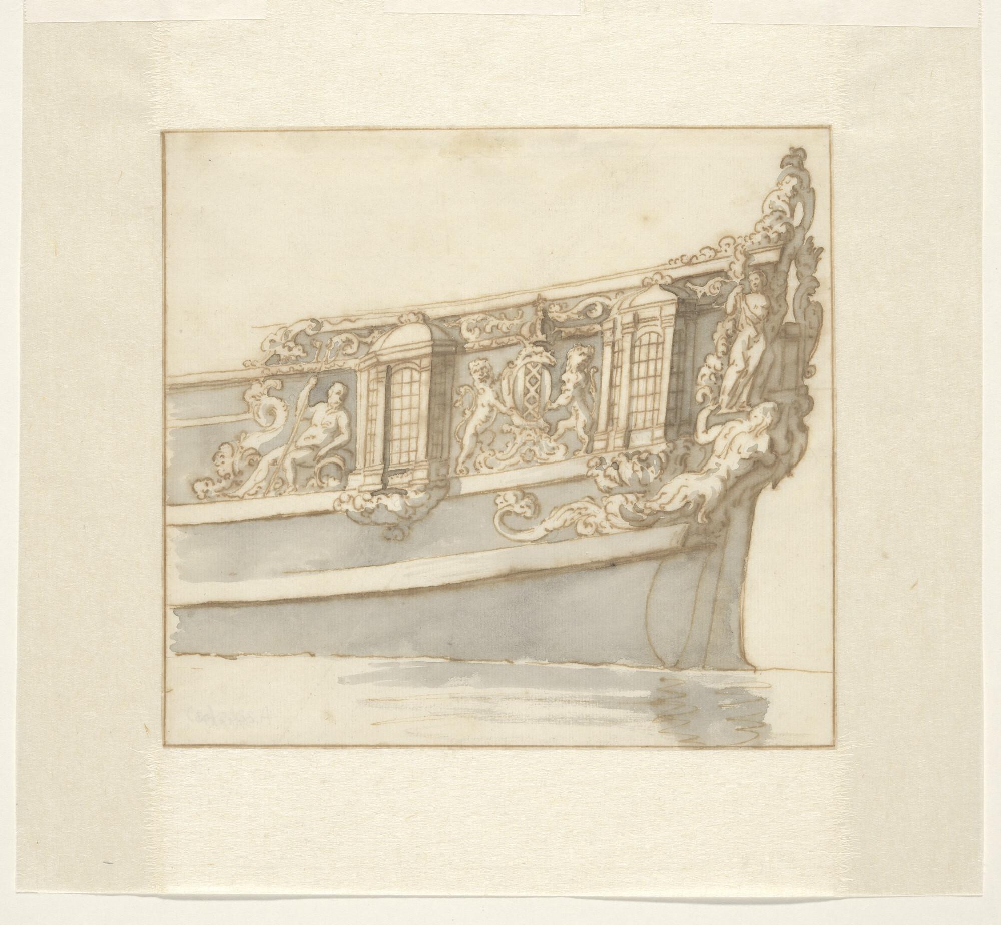 Een spiegelpaviljoenjacht, aanzicht van de bakboordzijde achter; tussen de twee zijgalerijen het stadswapen van Amsterdam.