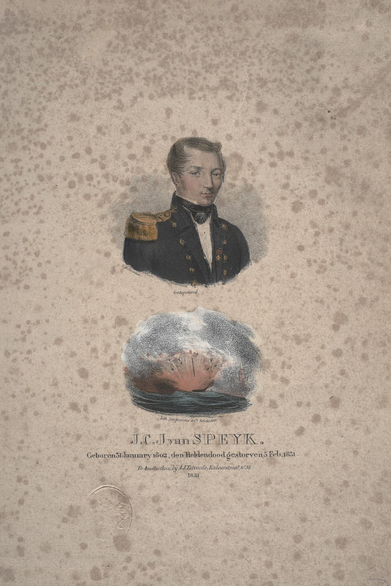 Portret van Van Speyk en de ontploffing van zijn schip.
