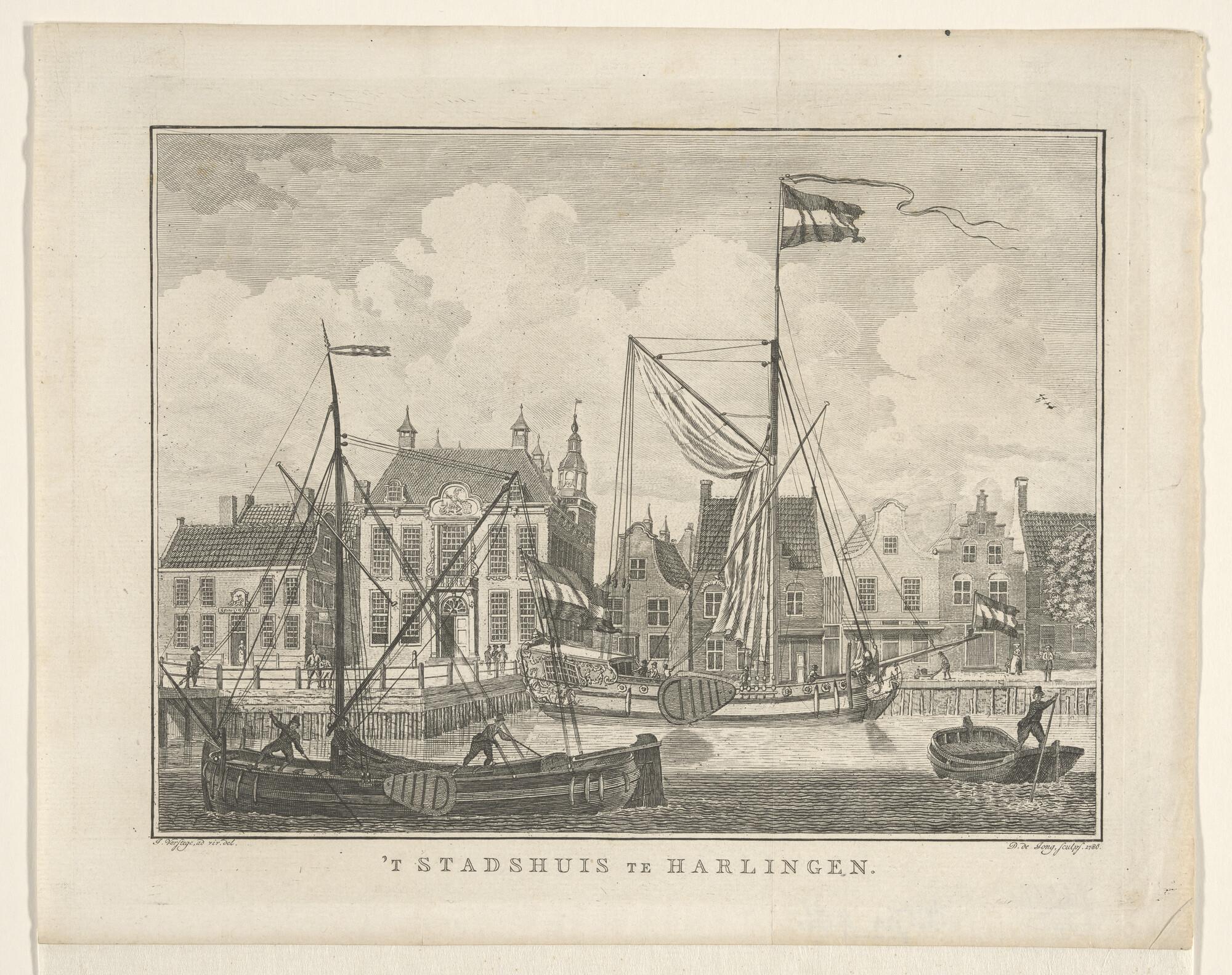 Het stadhuis te Harlingen. Op de voorgrond de haven met rechts een statenjacht en links een binnenvaartschip met spriettuig.