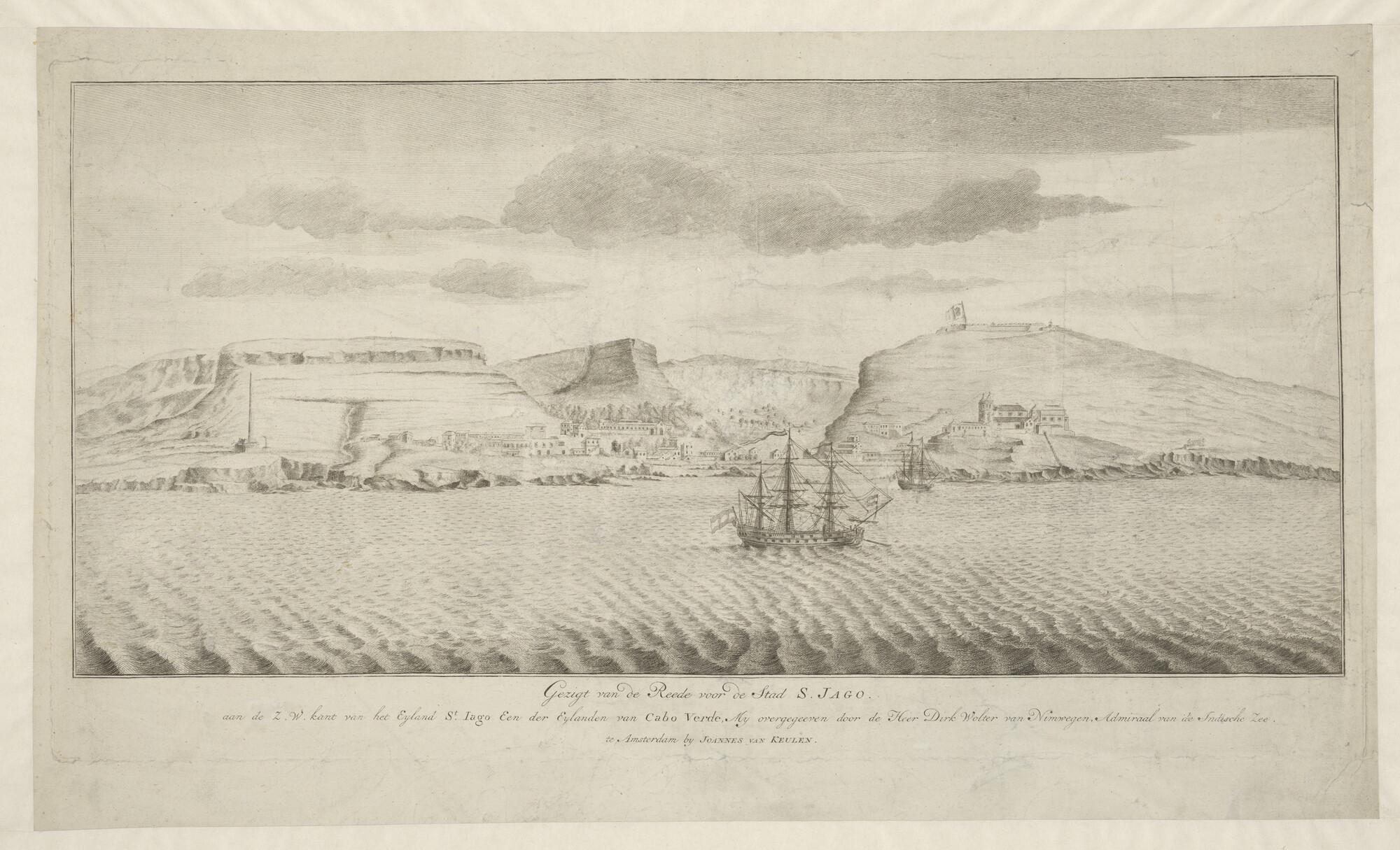 De rede van St. Jago, Kaapverdische Eilanden, met een Nederlands oorlogsschip op de rede.