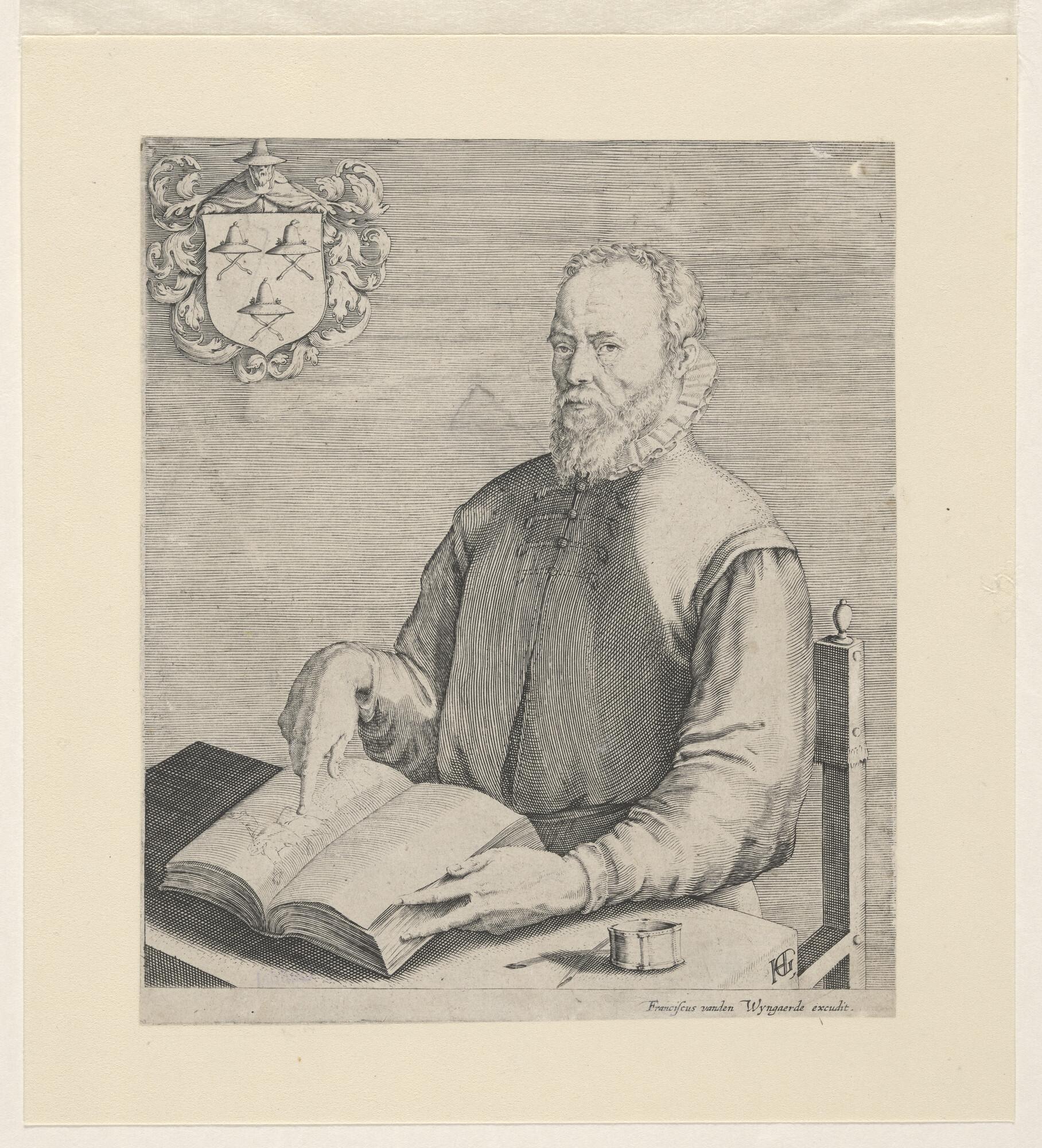Portret van G. de Joode [1508/09-1591], broer van de graveur Pieter de Joode, gezeten aan tafel, wijzend op een illustratie in een boek (God de Vader, zwevend boven de aardkloot).
