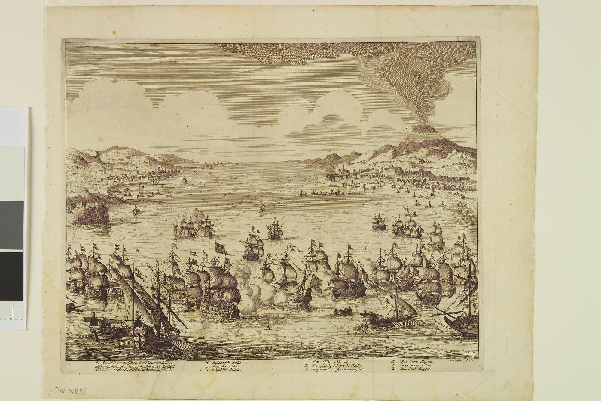 Zeeslag bij Sicilië in het gezicht van de Etna, tussen De Ruiter en Duquesne, 22 april 1676. Met Duits onderschrift.