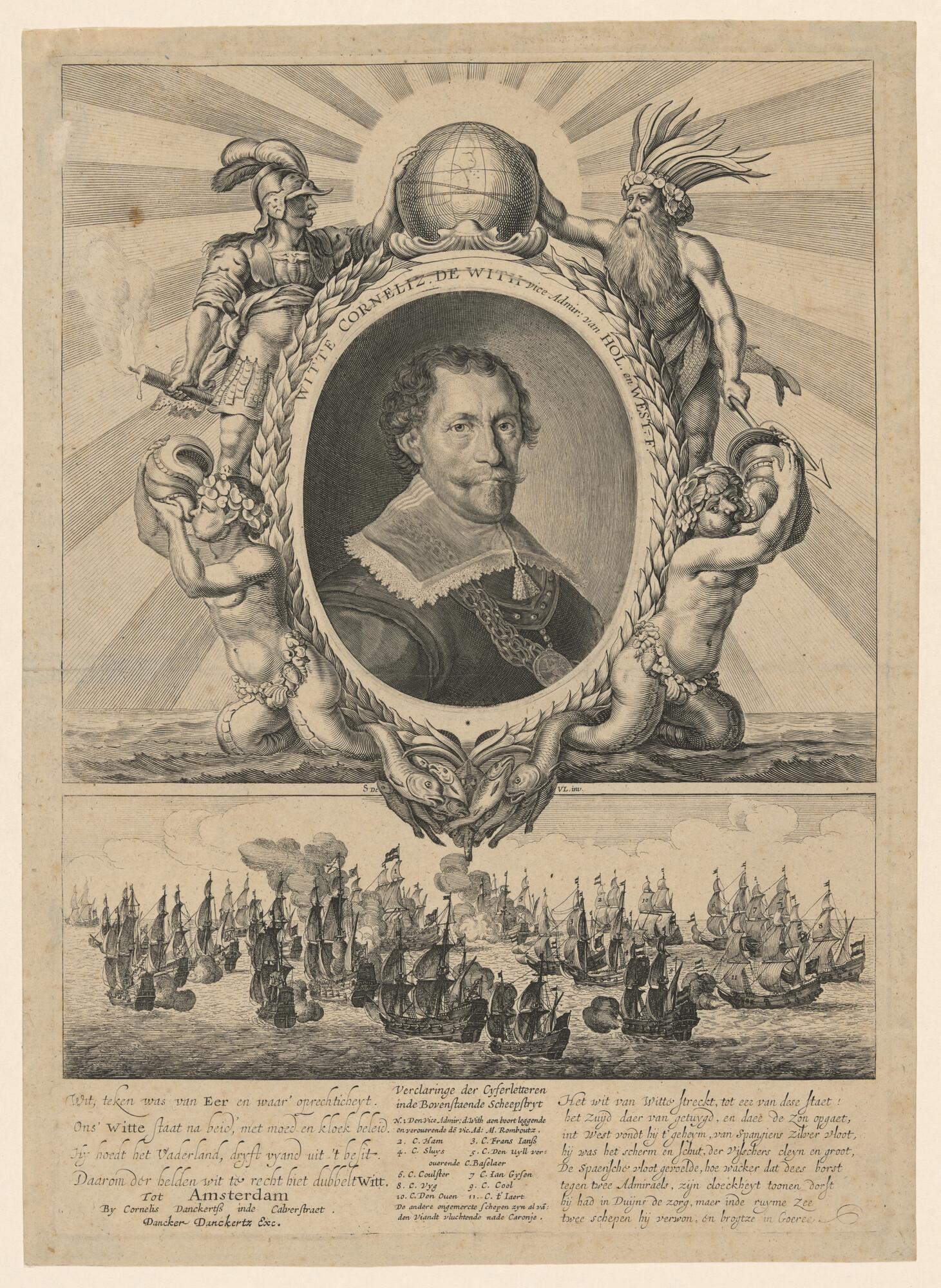 Portret van Vice-Admiraal Witte Cornelisz. de With, in cartouche met allegorische figuren; onder het portret een zeeslag, daaronder een twaalfregelig vers en legenda.