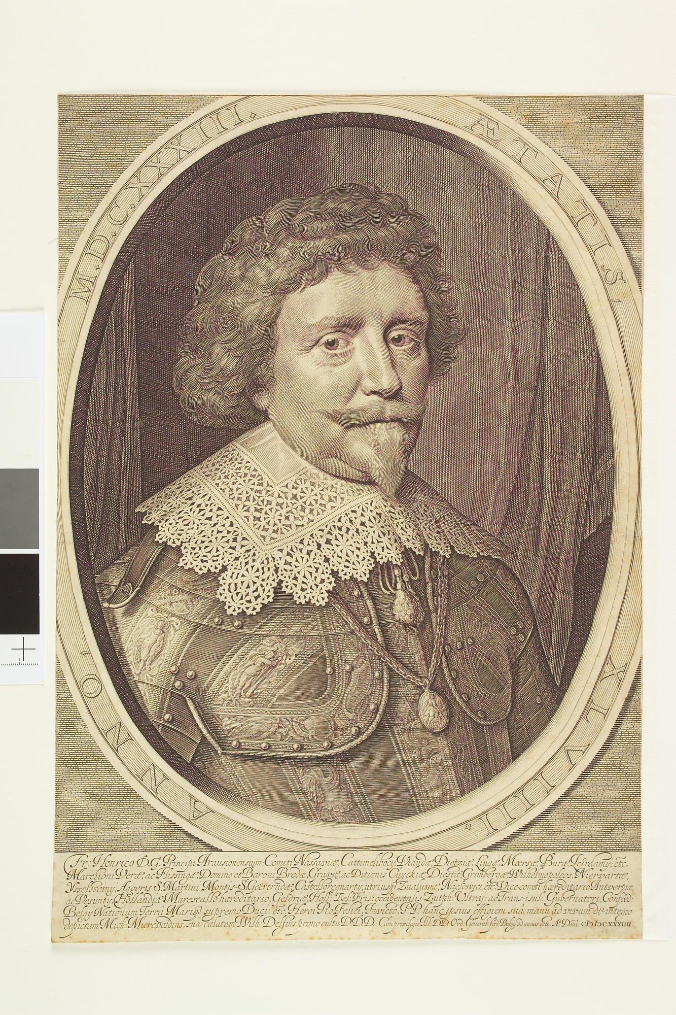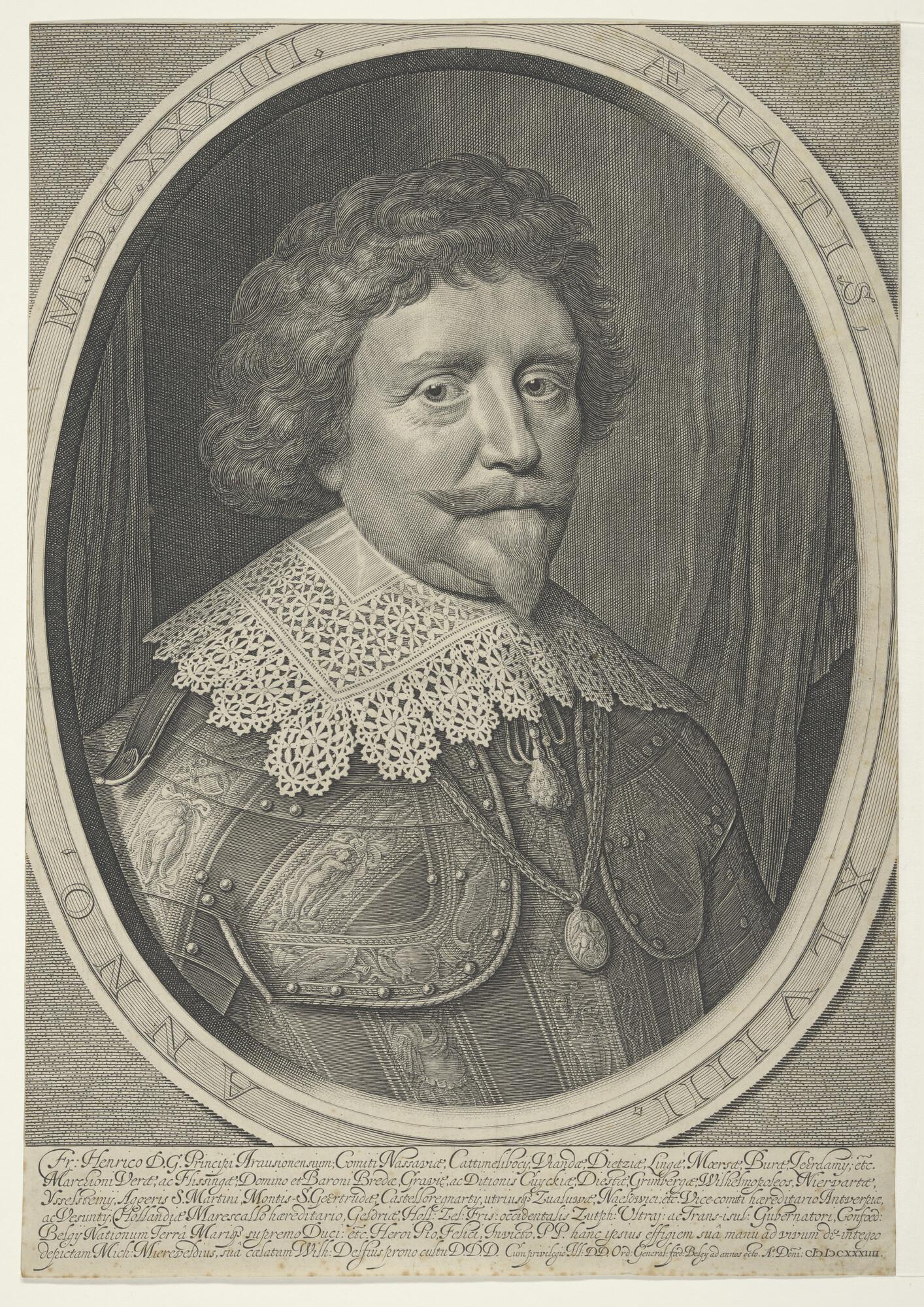Portret van stadhouder Frederik Hendrik in medaillon op 48-jarige leeftijd.