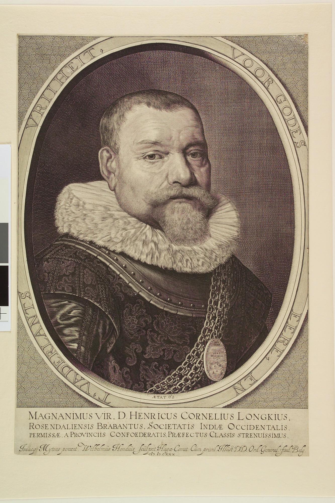 Portret van Hendrik Loncq, admiraal van Holland en de WIC, borstbeeld in kuras, met om zijn hals keten, waaraan een ketting met betrekkimg tot de Zilvervloot.