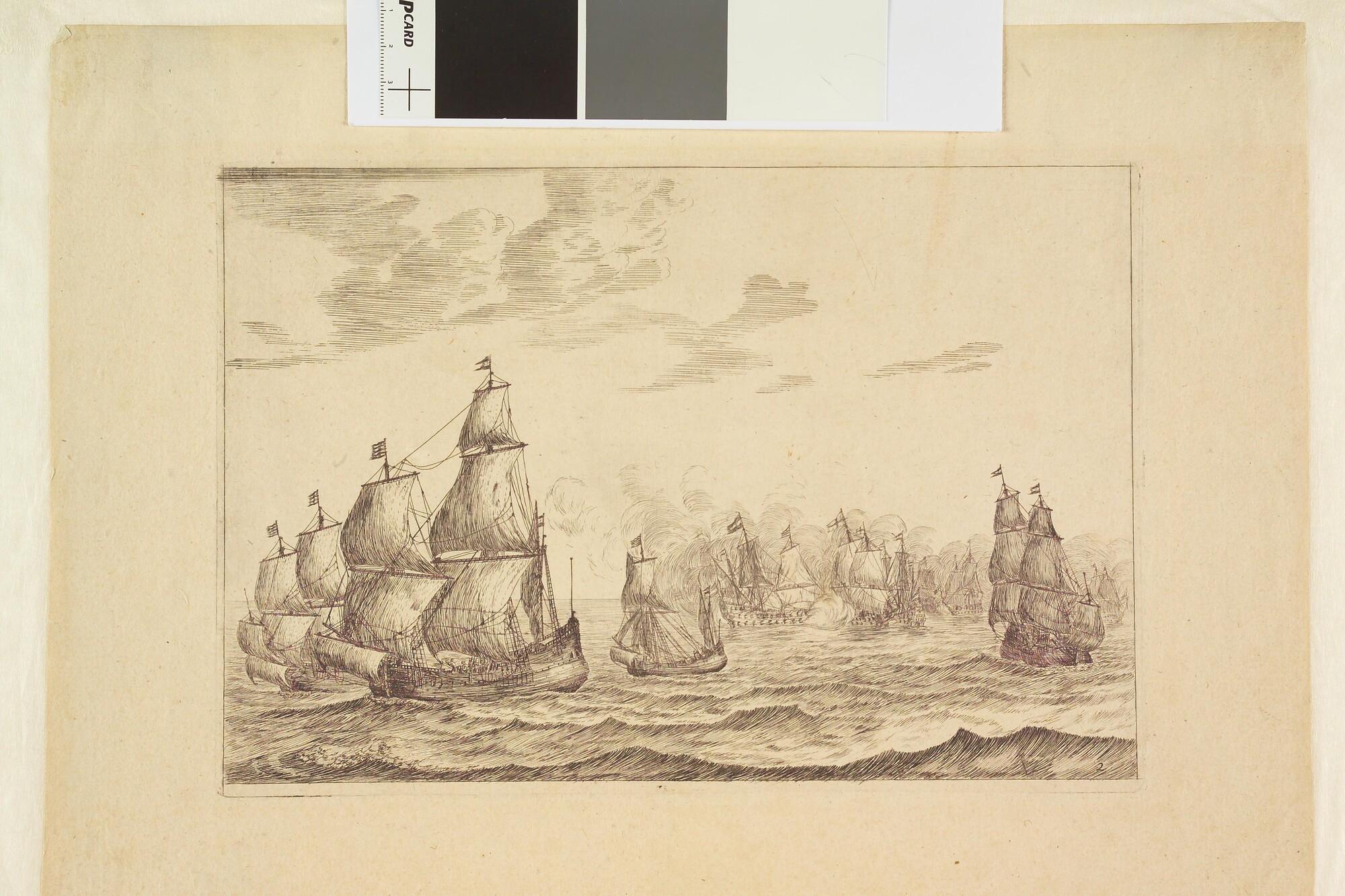 Prent van voor de wind weglopende fluiten en een galjoot, met op de achtergrond Nederlandse en Engelse schepen in gevecht. Ets nummer 2 van de suite van acht etsen "Nieuwe Scheeps Batalien".