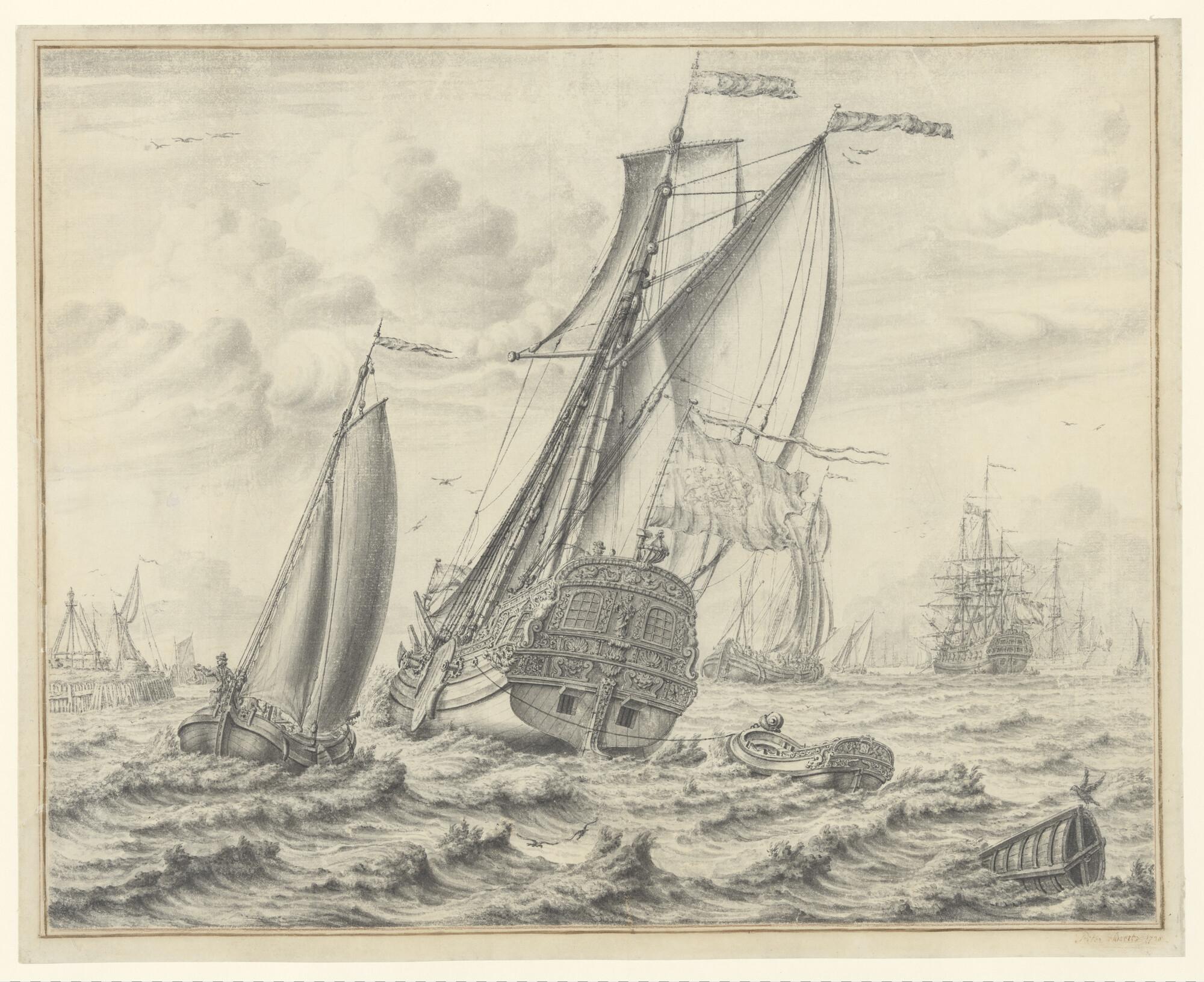 Een Admiraliteitsjacht en andere schepen op een rede