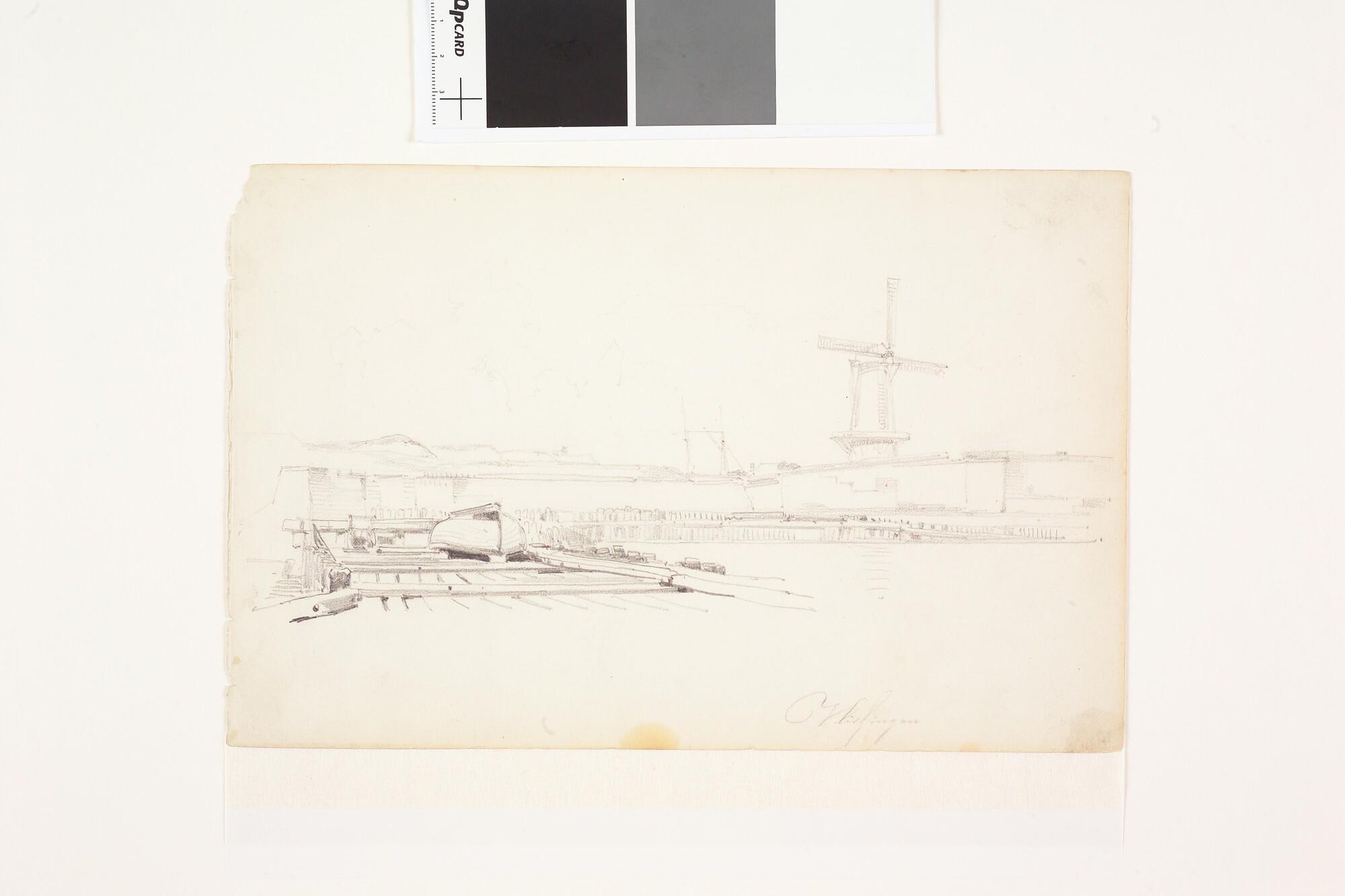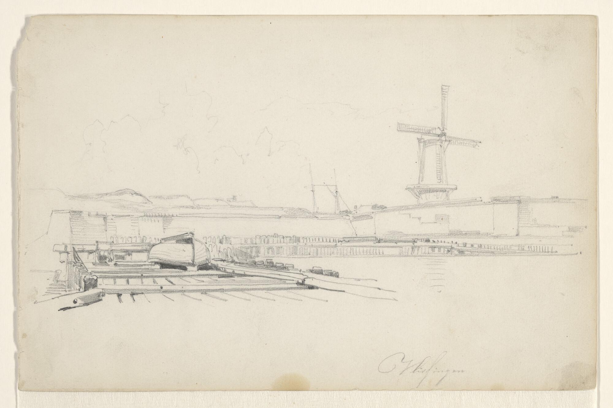 Gezicht op de haven van Vlissingen, met rechts een molen.