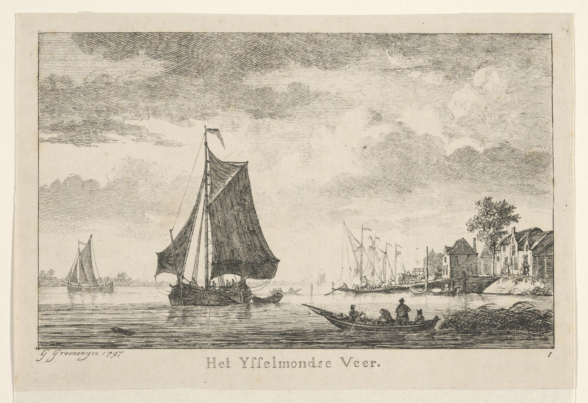 Prent van het IJsselmondse Veer. Uit de suite Riviergezichten op de Maas, suite van 6 etsen. Nr. 1.