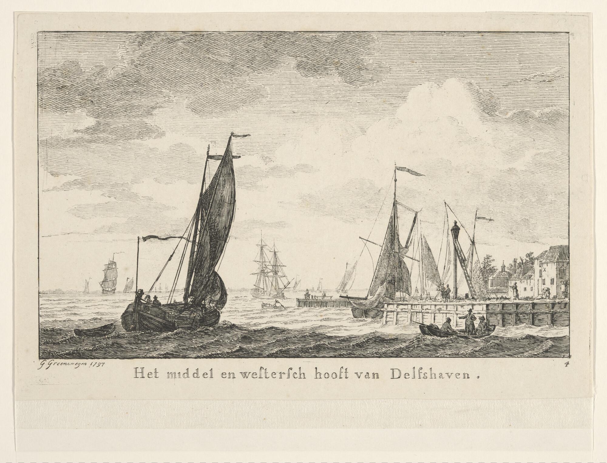 Prent van de havenhoofden van Delfshaven. Uit de suite Riviergezichten op de Maas, suite van 6 etsen. Nr. 4.