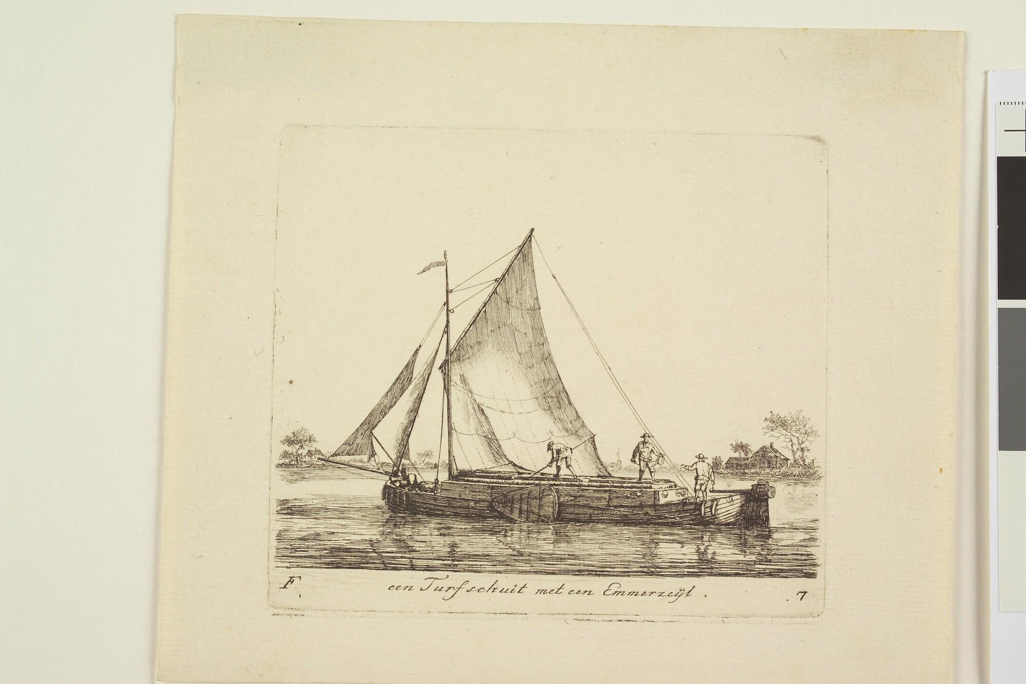 Een turfschuit met een emmerzeil. Uit de suite 'Verscheide soorten van Hollandse vaartuigen'.