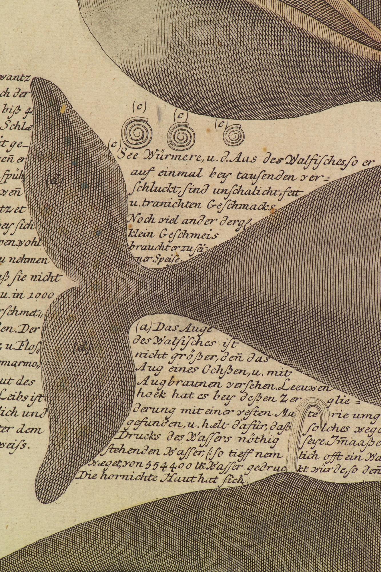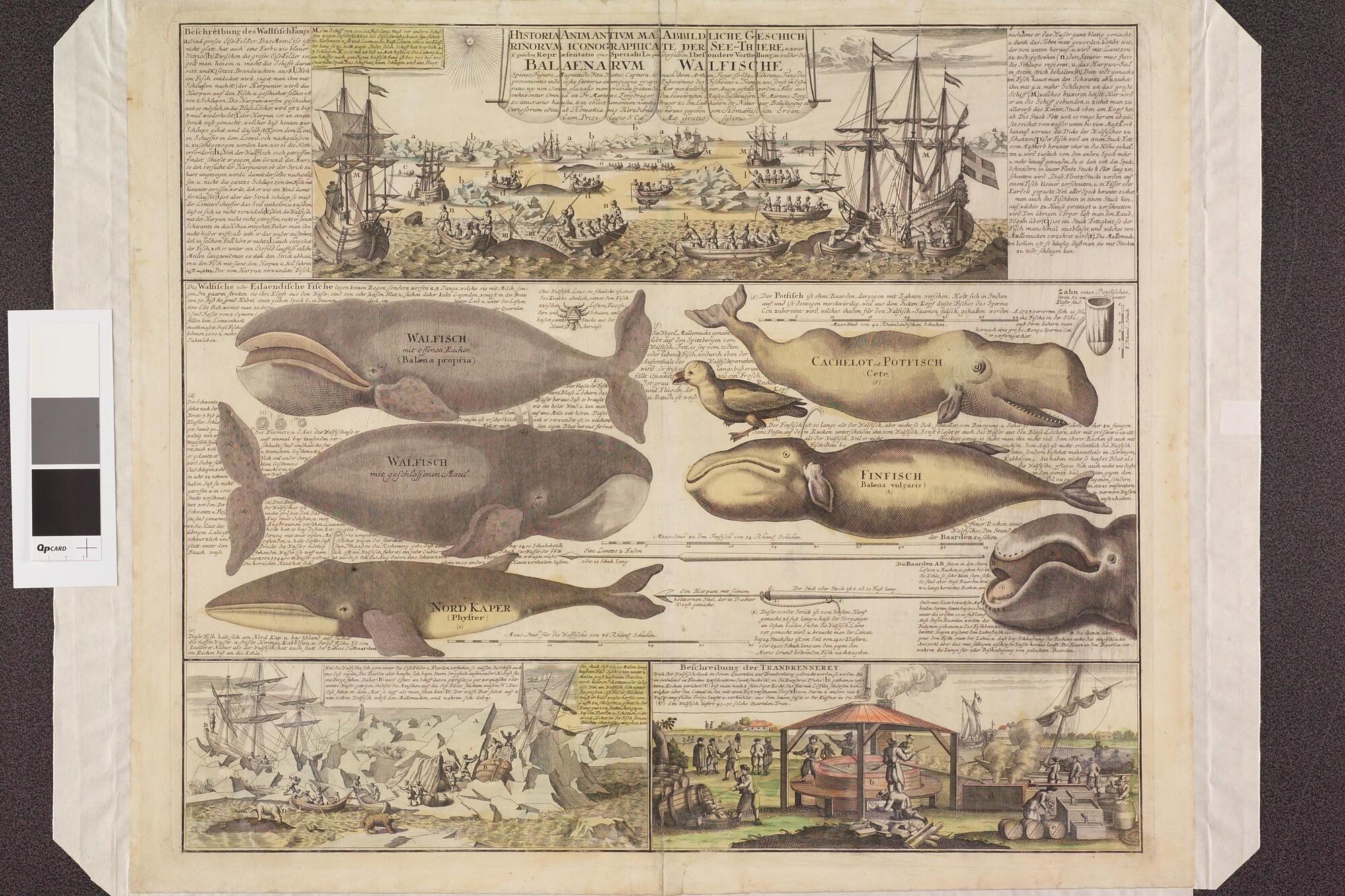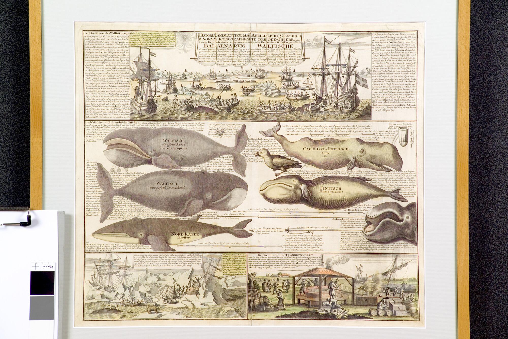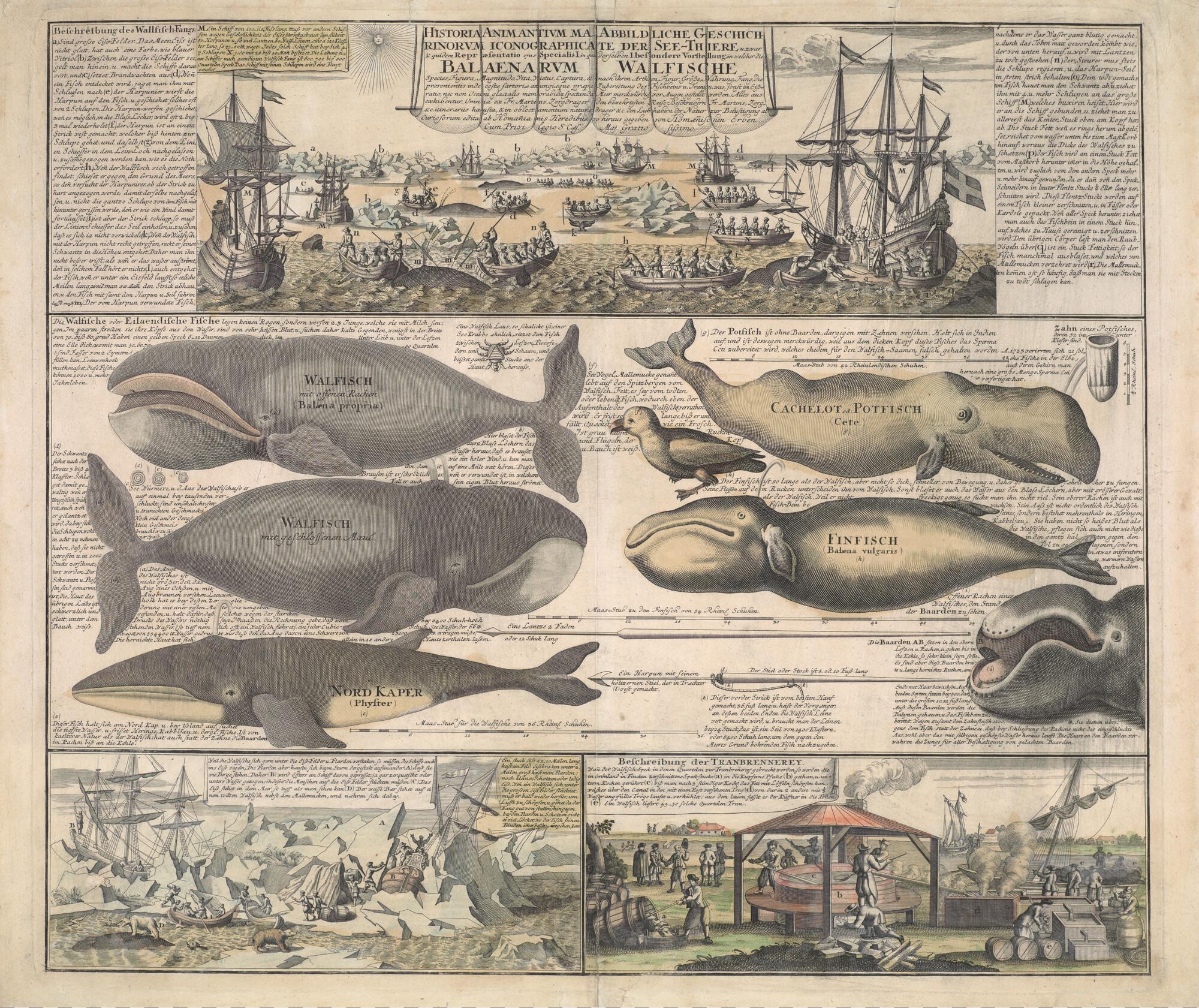 Walvissen en walvisvangst in de Noordelijke IJszee: verschillende soorten walvissen, omgeven door afbeeldingen van de walvisvangst, walvisvaarder in het ijs beklemd en de traanbereiding. De prent is uitgegeven in Neurenberg door de Homännischen Erben en behoort tot een serie van vier dergelijke grote prenten. De andere behandelen landdieren (olifant, neushoorn en krokodil). Deze prent is ...