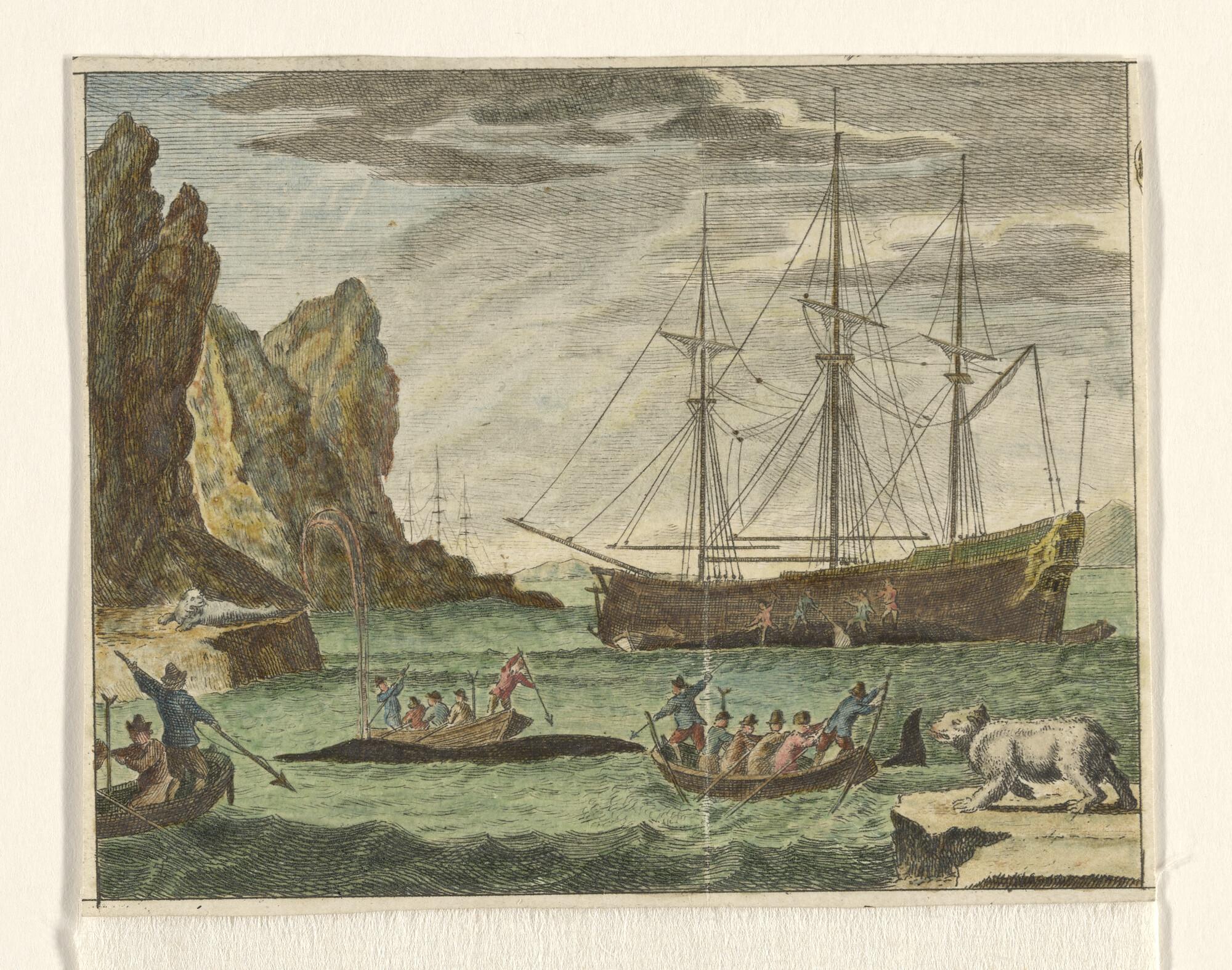 Walvisvangst bij een rotsige kust.