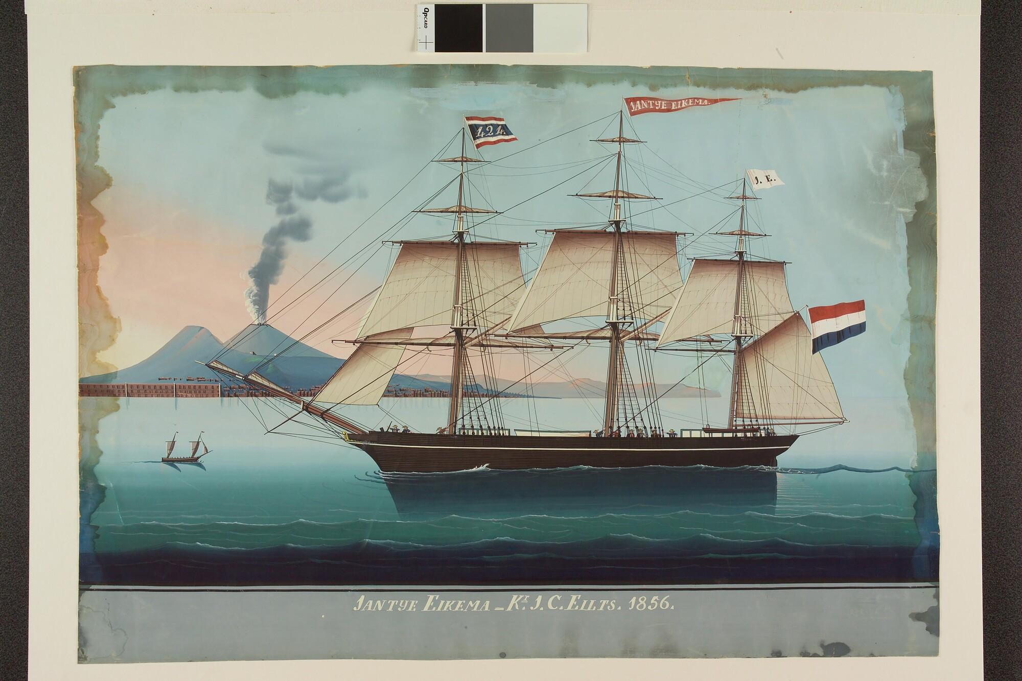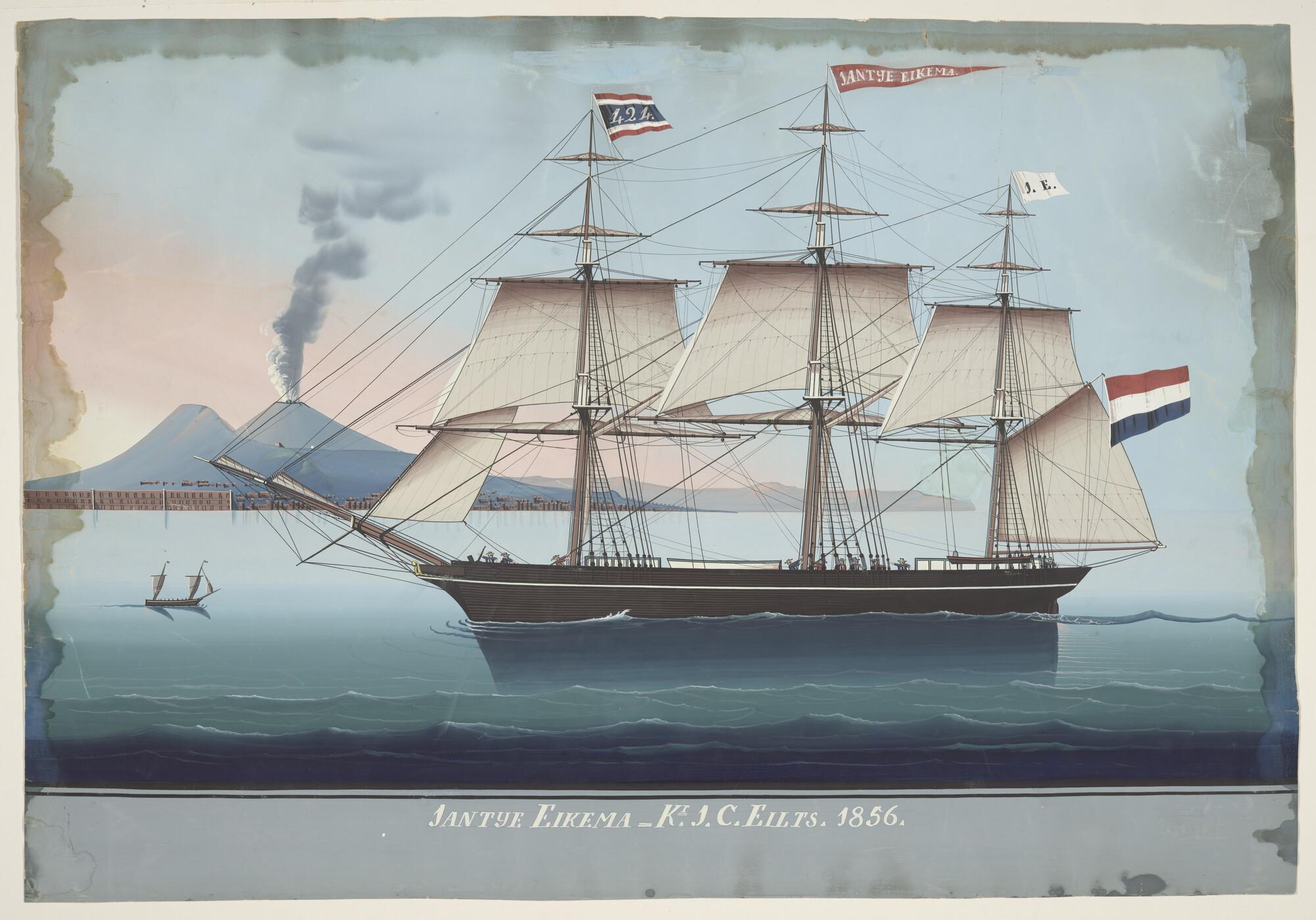 Het fregatschip "Jantje Eikema", zeilend onder klein zeil ter hoogte van Napels, met op de achtergrond de Vesuvius. het schip voert in de voortop een vlag met no. 424, in de grote top de naamvlag en in de kruistop de vlag van reder J.C. Eilts te Delfzijl,.