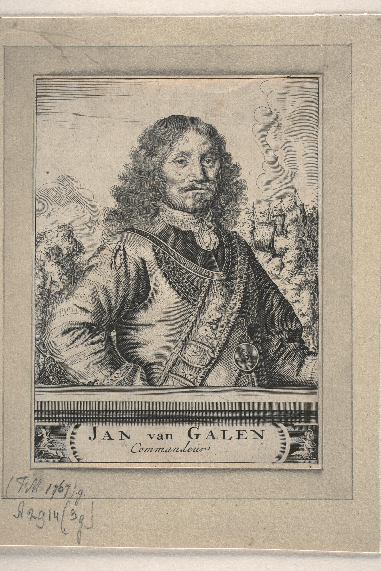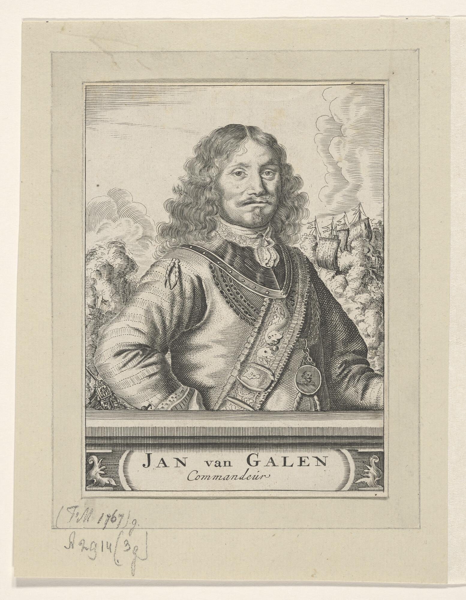 Portret van Jan van Galen, commandeur met rechts een zeegevecht.
