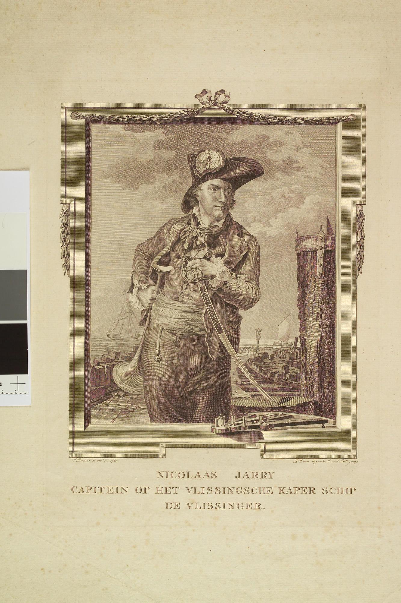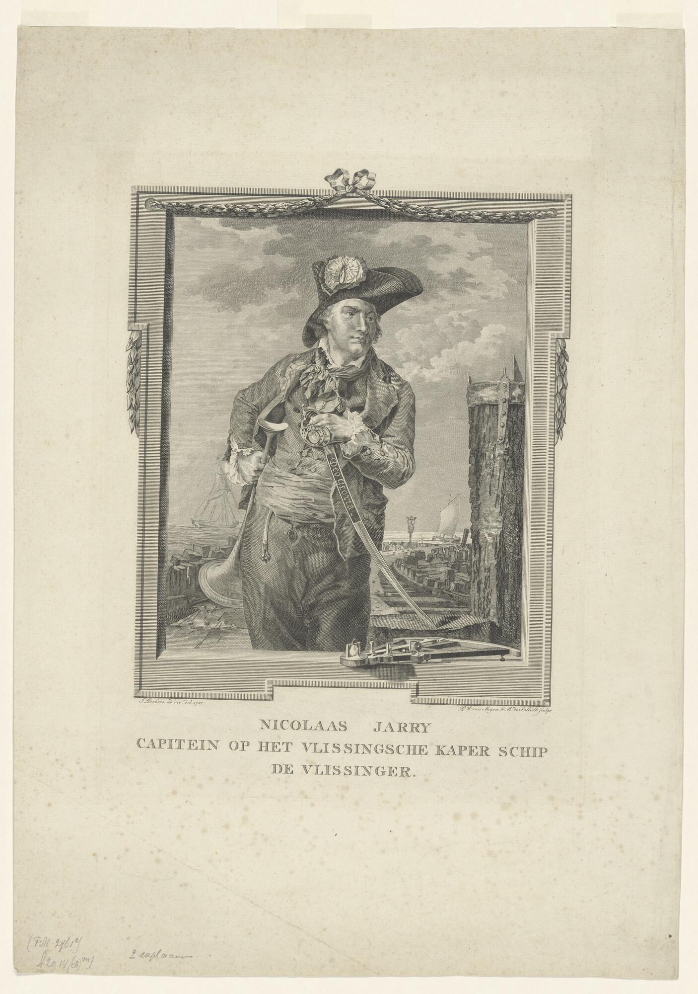 Portret van de kaper Kapitein Nicolaas Jarry met in zijn rechterhand een scheepsroeper, in de linker een sabel met de tekst "'Deo Gloria"; op de voorgrond een octant