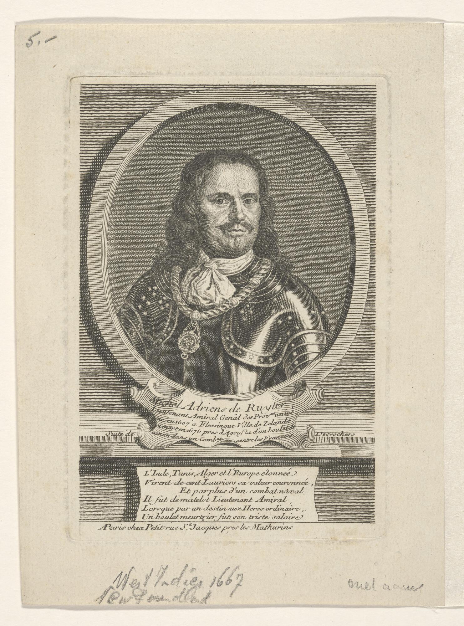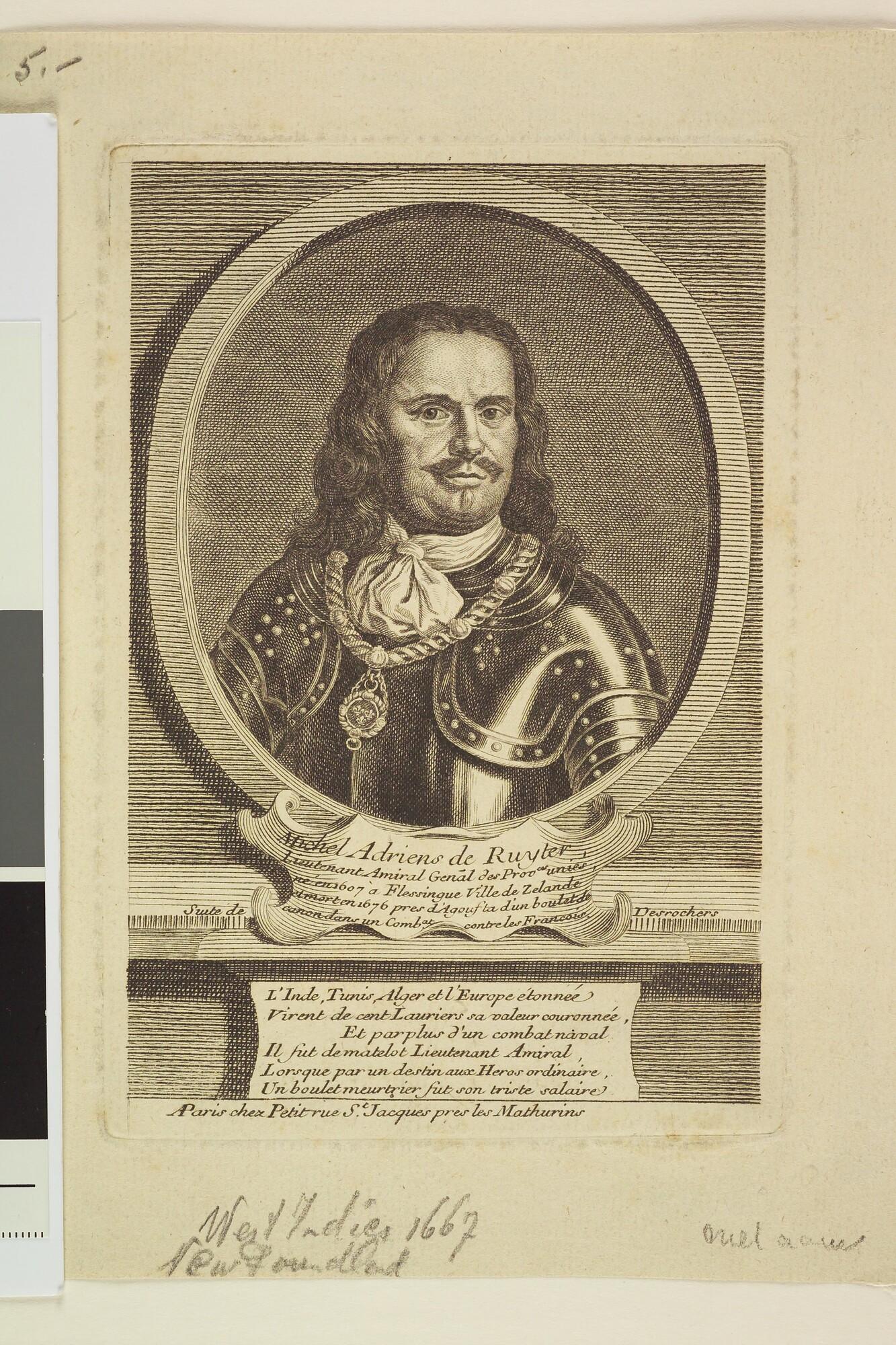 Portret van Michiel A. de Ruyter, geharnast borstbeeld van voren in ovaal.