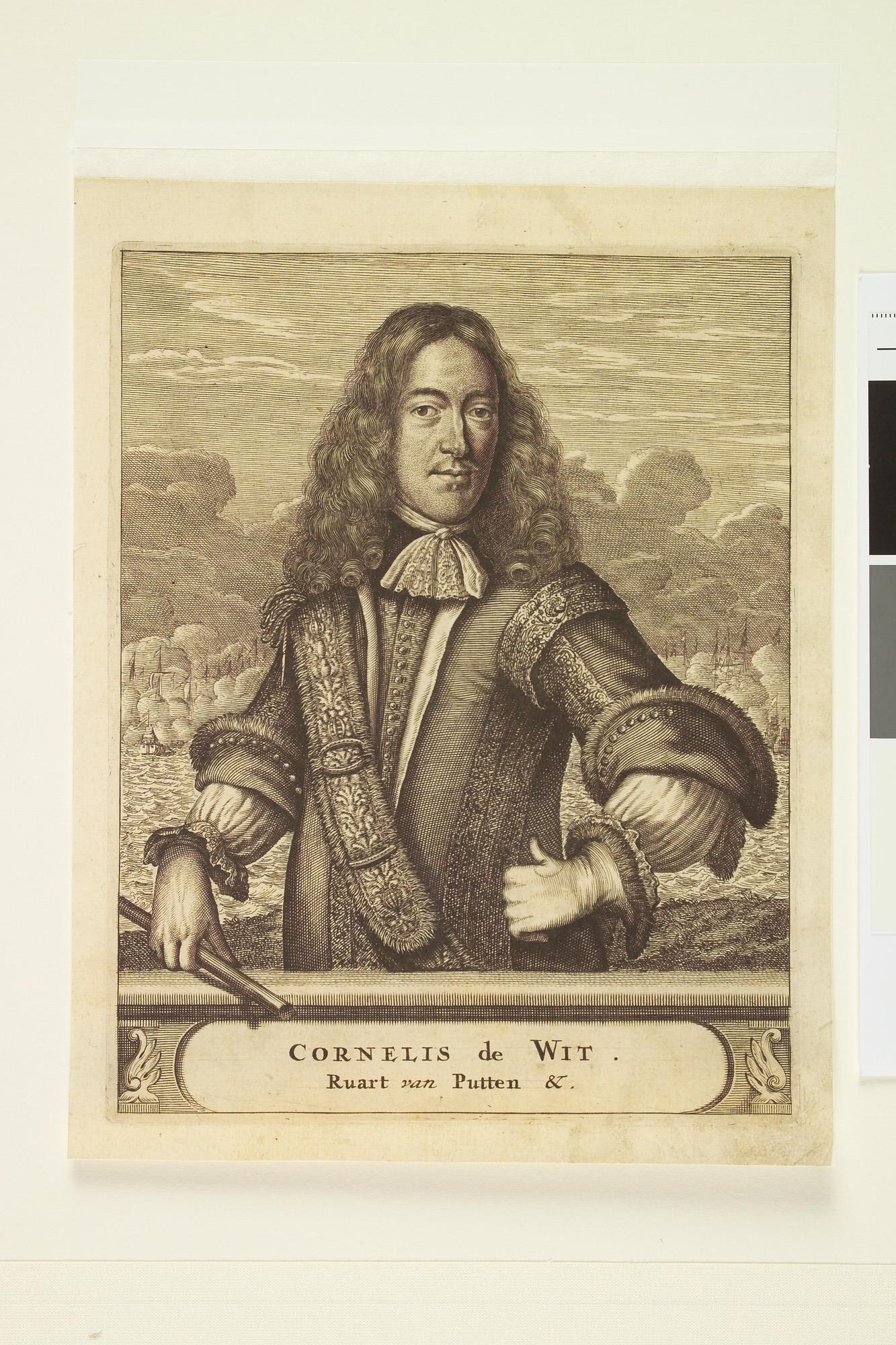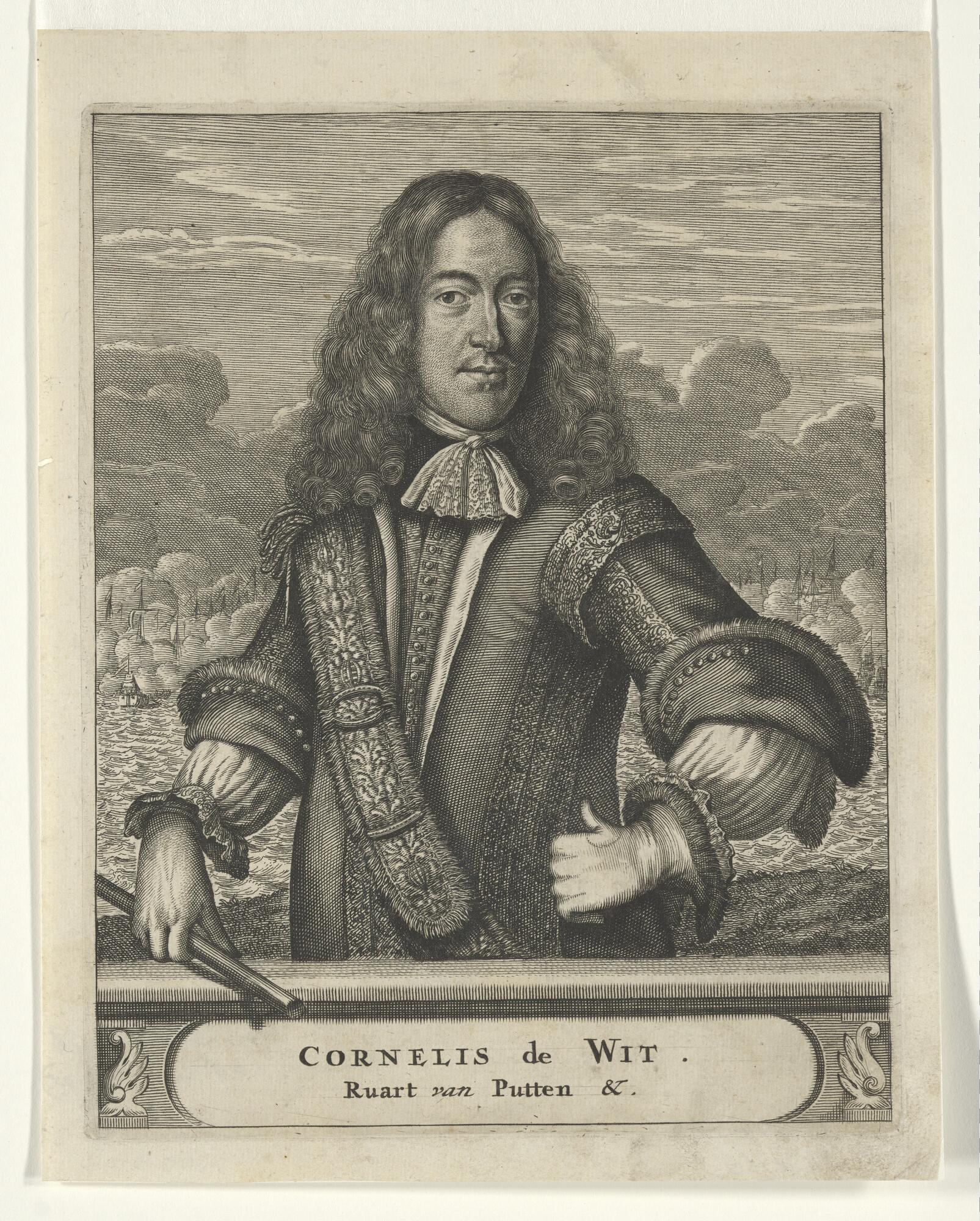 Portret van Cornelis de Witt met een kleine das, commandostaf in de rechterhand en op de achtergrond een zeeslag.