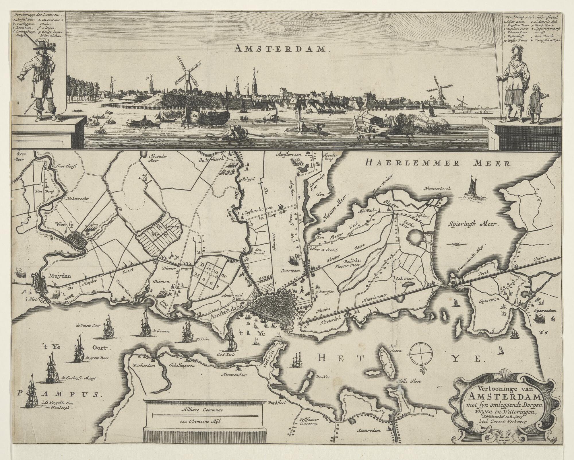 Panorama van Amsterdam vanaf de Amstel met kaart van Amsterdam en omgeving, ten tijde van het beleg van Amsterdam door Willem II.