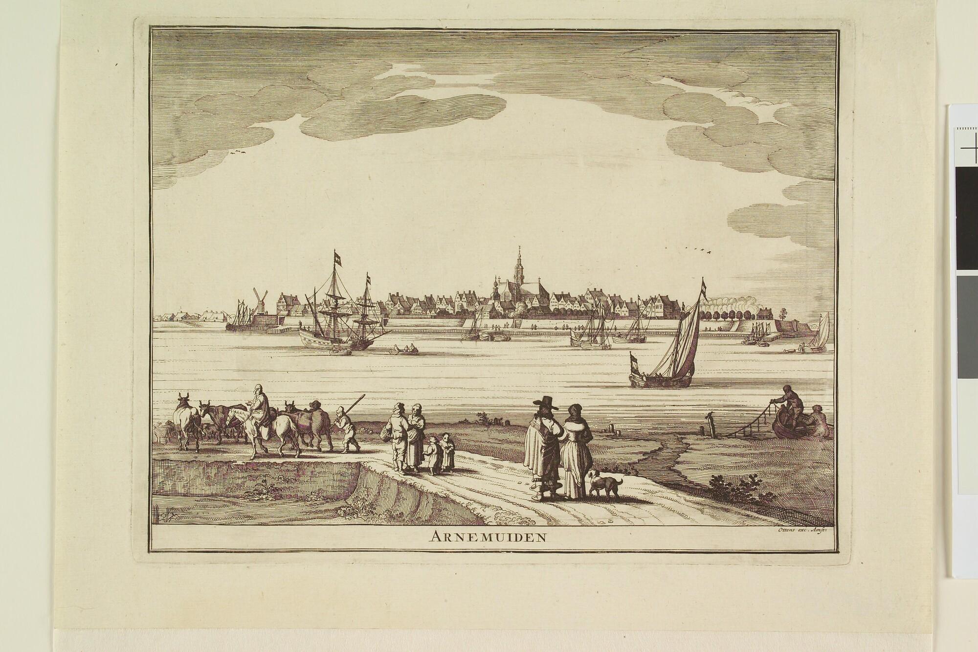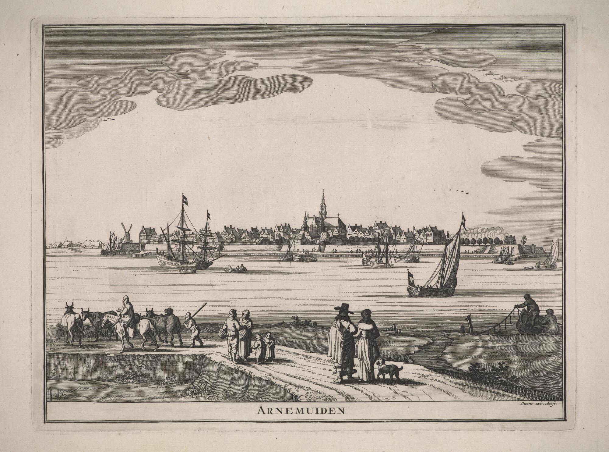 Gezicht op Arnemuiden; voor de stad een driemastschip en enige binnenschepen, op de voorgrond een dijk met wandelaars en vee.