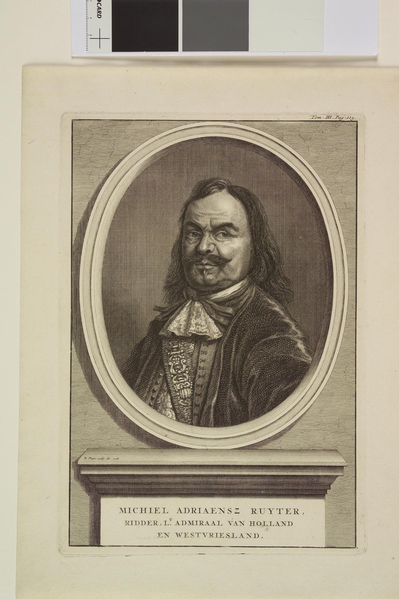 Portret van Michiel de Ruiter, borststuk naar voren en rechts, met daaronder