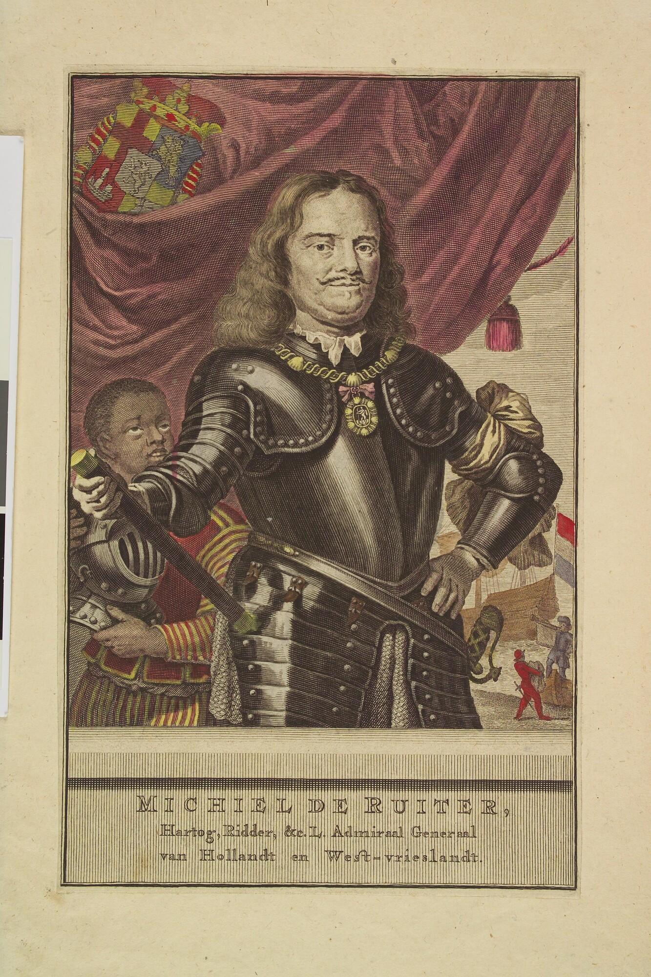 Portret van Michiel de Ruiter, geharnast heupstuk, met commandostaf in de rechterhand, met links een zwart jongetje.
