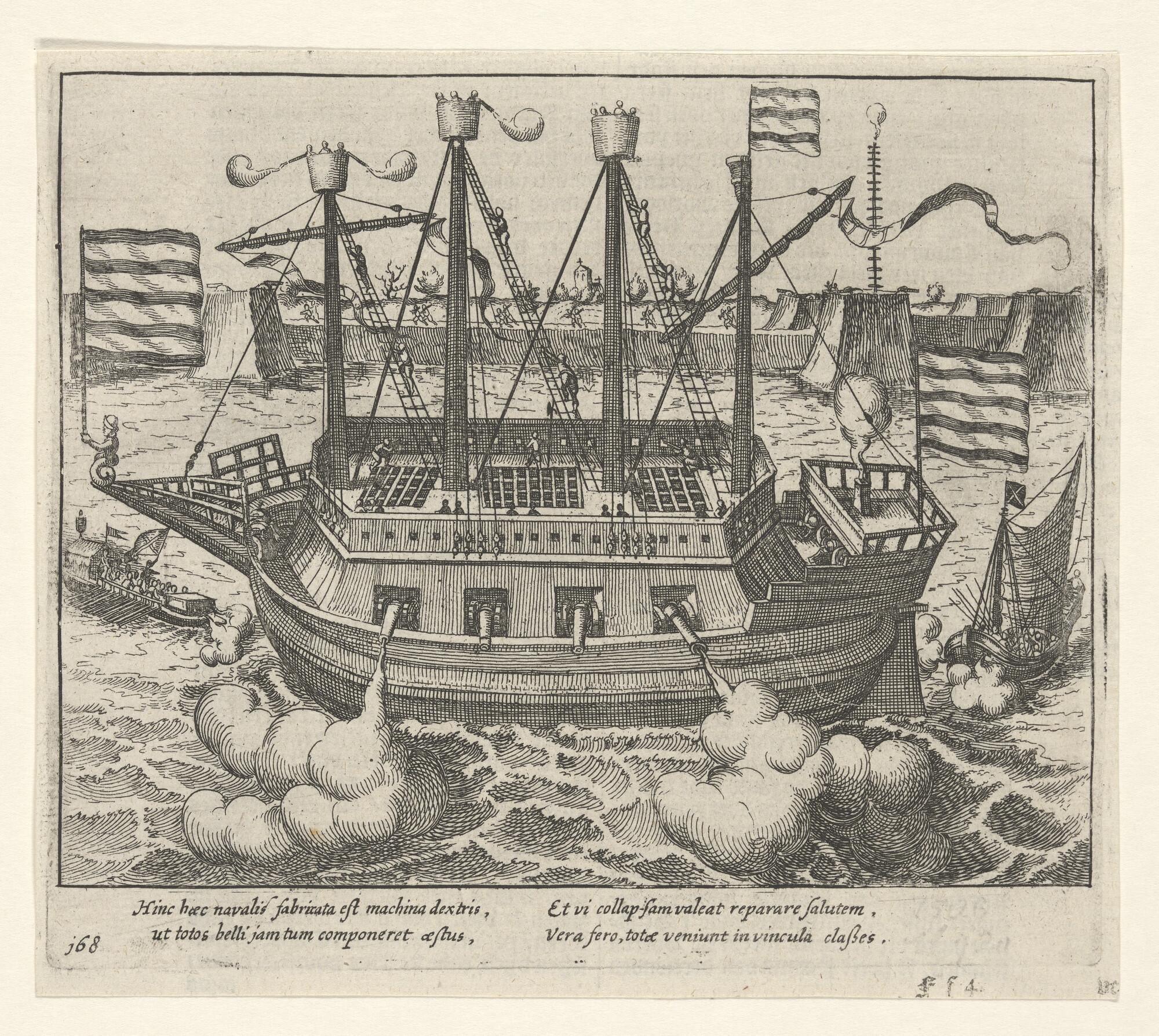Afbeelding van het schip door de Antwerpenaren toegerust en genoemd "Fin de la Guerre", door Parma op 27 mei 1585 genomen. Gravure uit Baudart blz. 168.