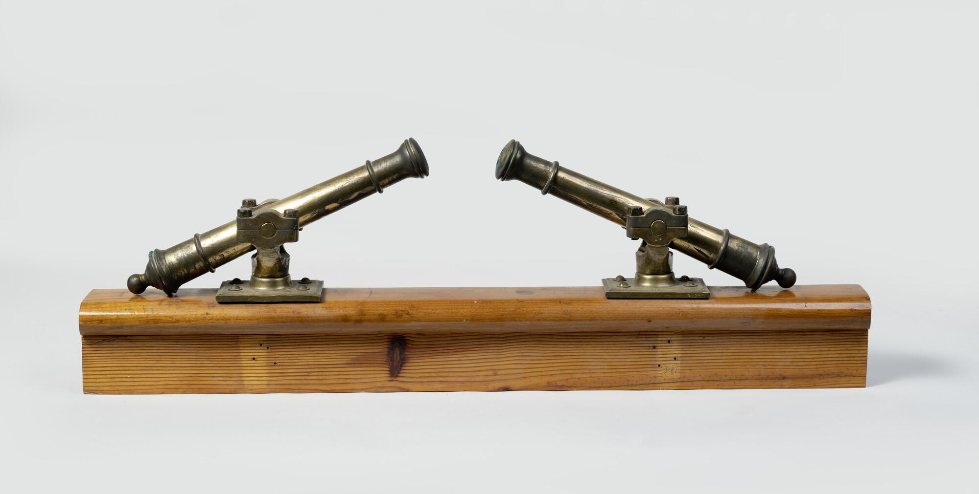 Kanon met pivots van een jacht gemonteerd op een potdeksel.
