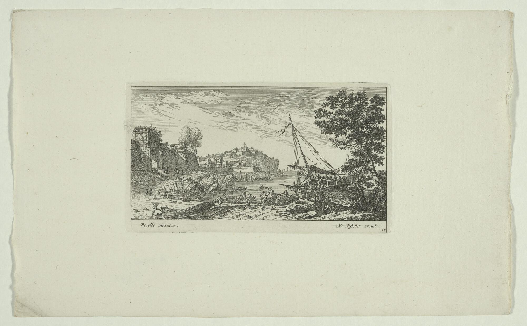 Gezicht op een haven in een landschap met ruïnes