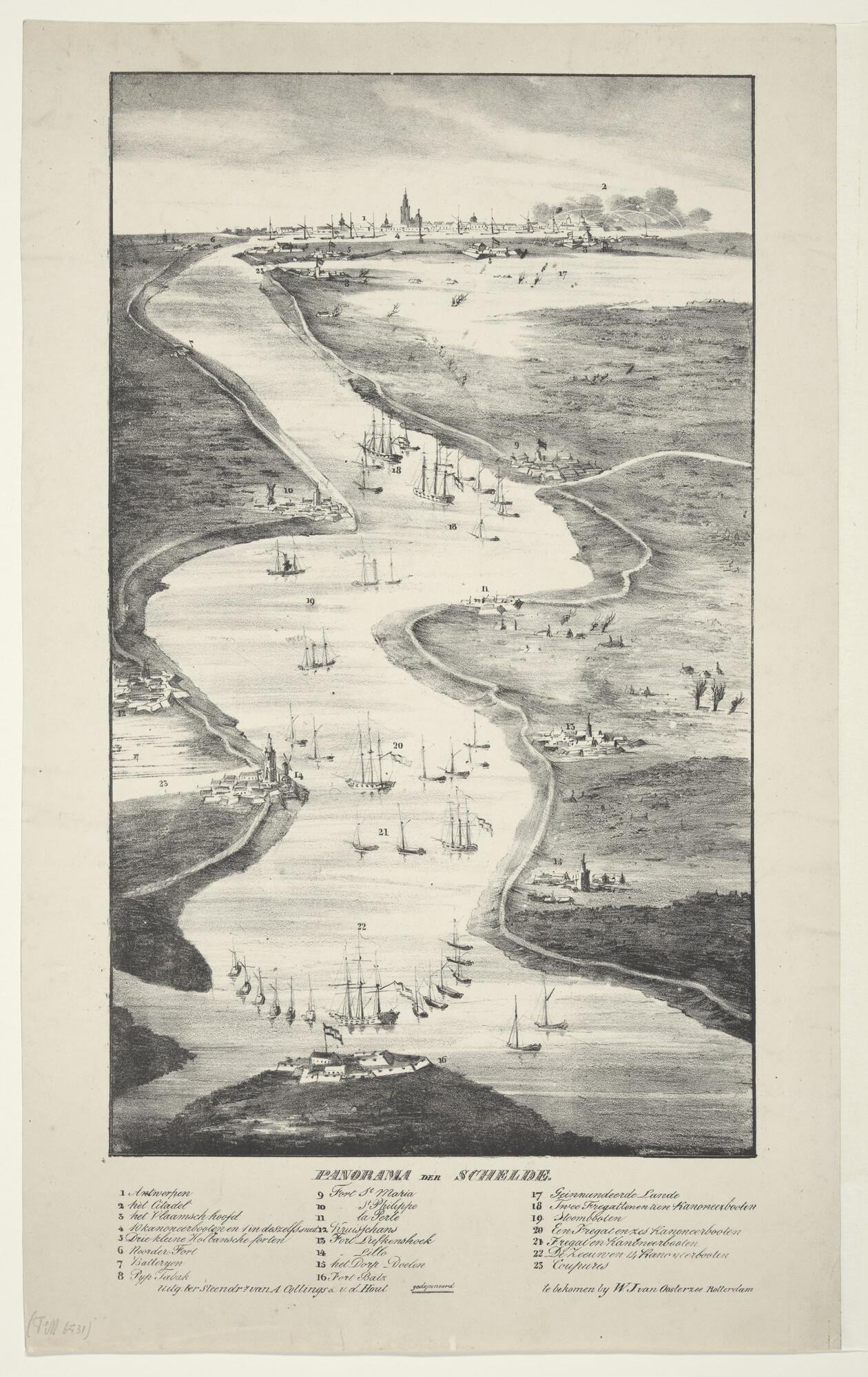Panorama van de Schelde: Antwerpen bovenaan, het fort Bath onderaan