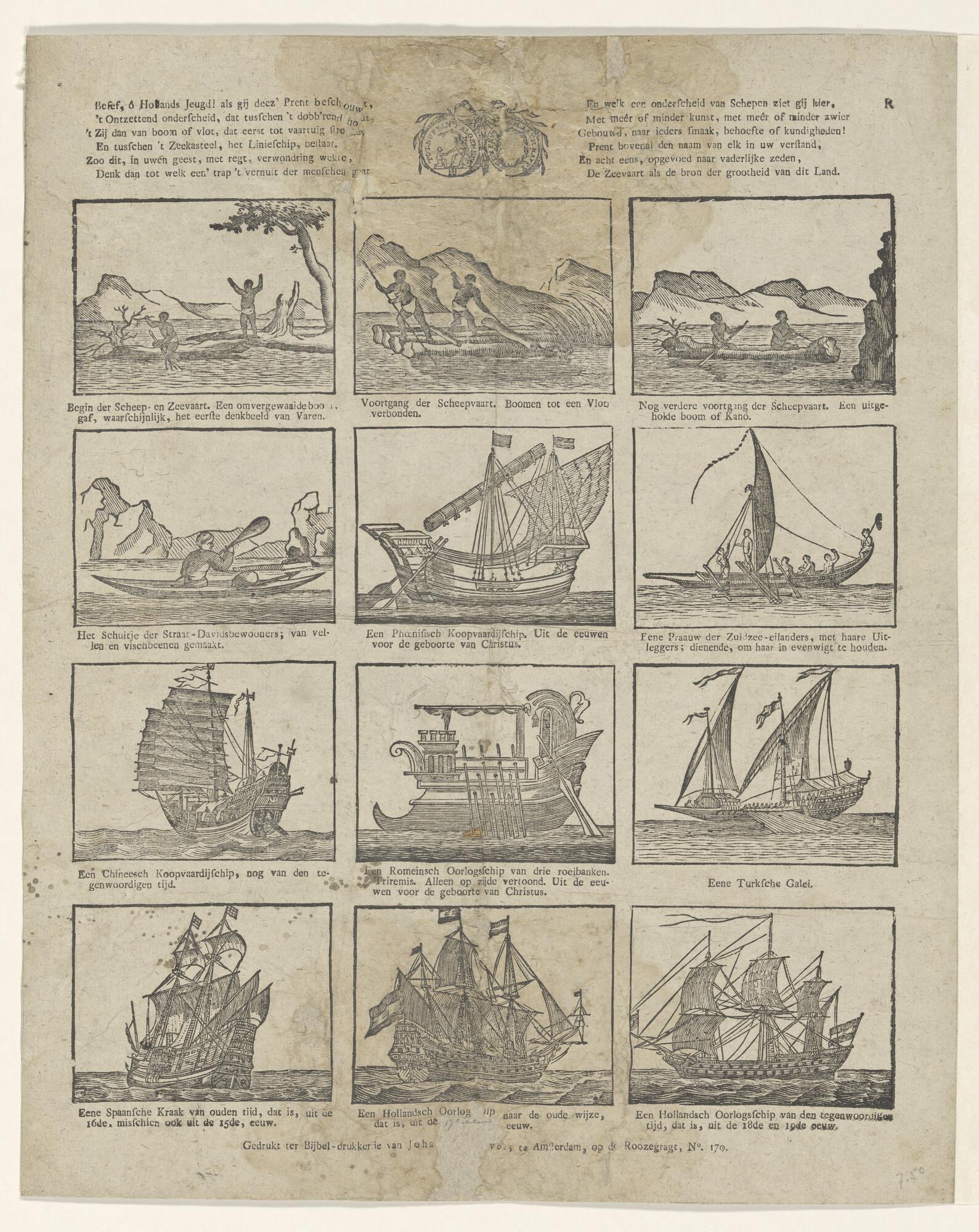 Berijmde kinderprent over de historische ontwikkeling van het schip, van boomstam tot negentiende-eeuws oorlogsschip, in twaalf afbeeldingen, met vignet van de Maatschappij tot Nut van 't Algemeen.