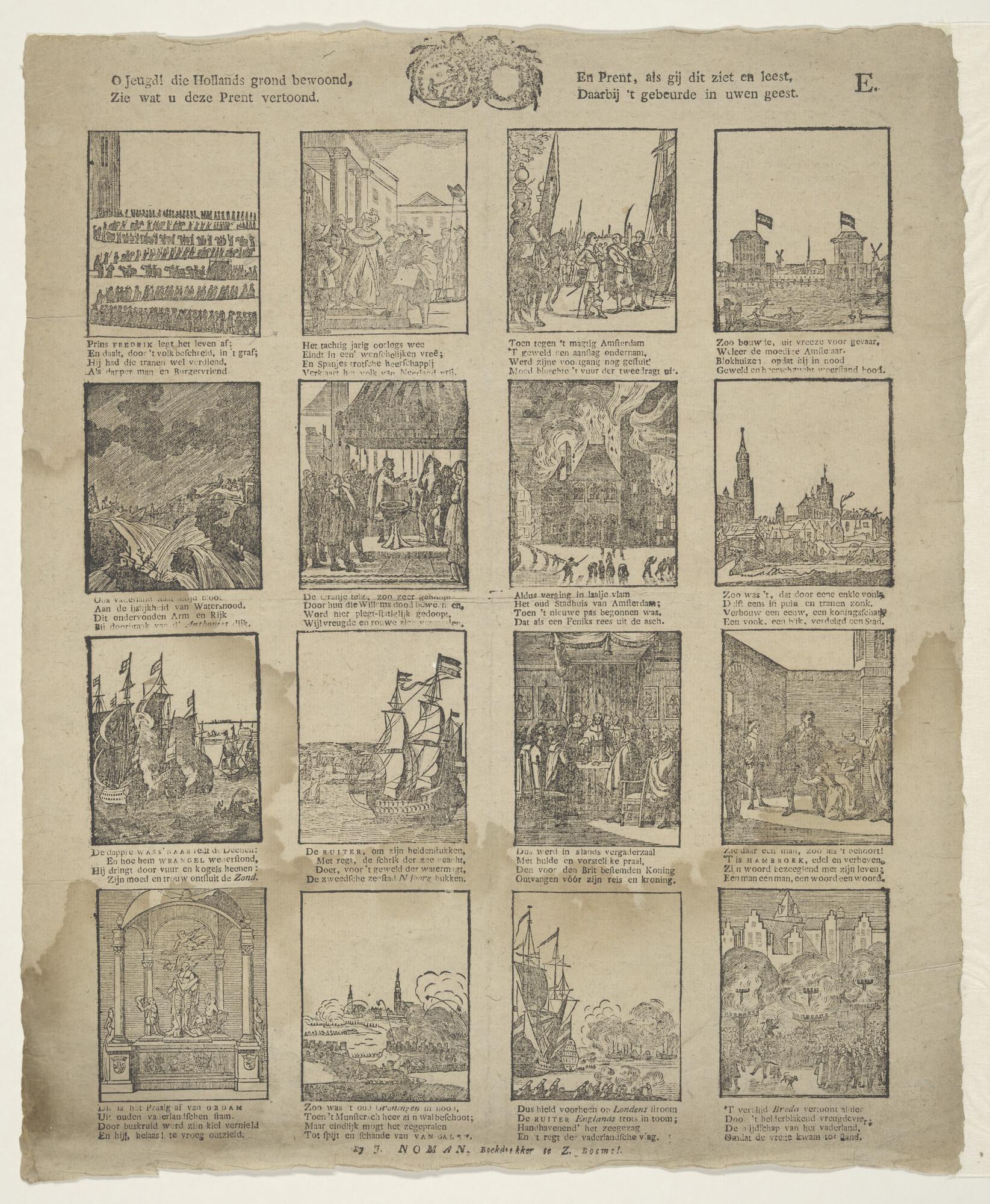 Berijmde kinderprent over de vaderlandse geschiedenis, met adres van J. Noman te Zaltbommel.