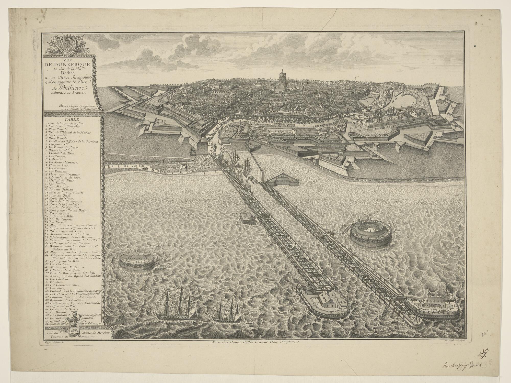 'Vue de Dunkerque du côté de la Mer.' Gezicht op Duinkerken, met opdracht aan de Franse admiraal Hertog de Penthièvre.