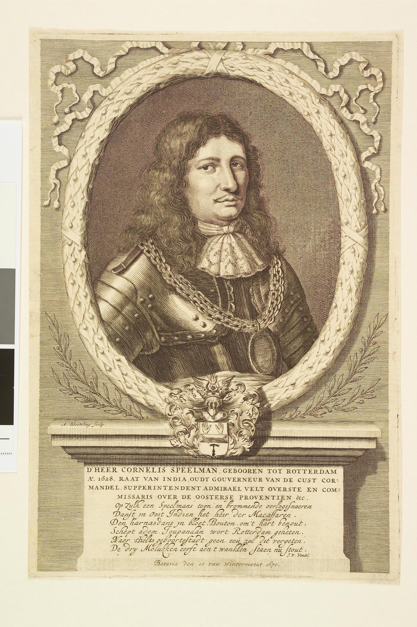 Portret van Cornelis Speelman (1628 - 1684), als raad van Indië etc.; borstbeeld in ovaal naar rechts, met wapen en zesregelig vers van Joost van den Vondel.