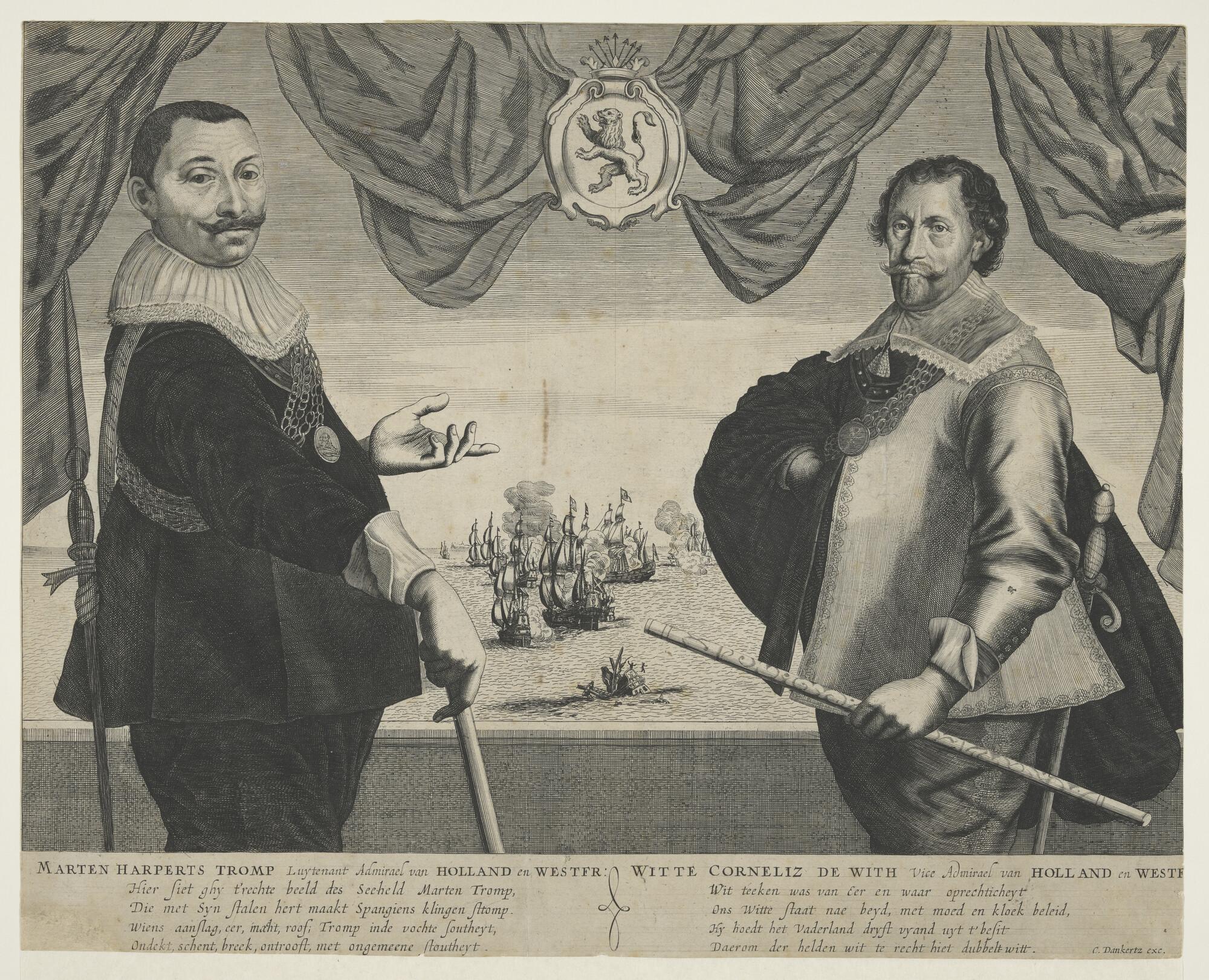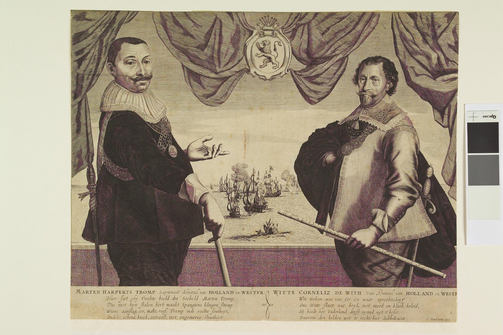 De admiraals M.H. Tromp en W.C. de With. Op de achtergrond een zeeslag.