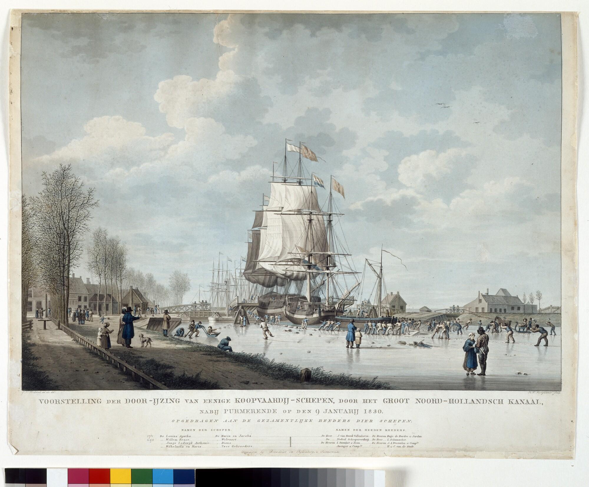 Het door-ijzing van enige schepen door het Groot- Noord-Hollands Kanaal, 1830