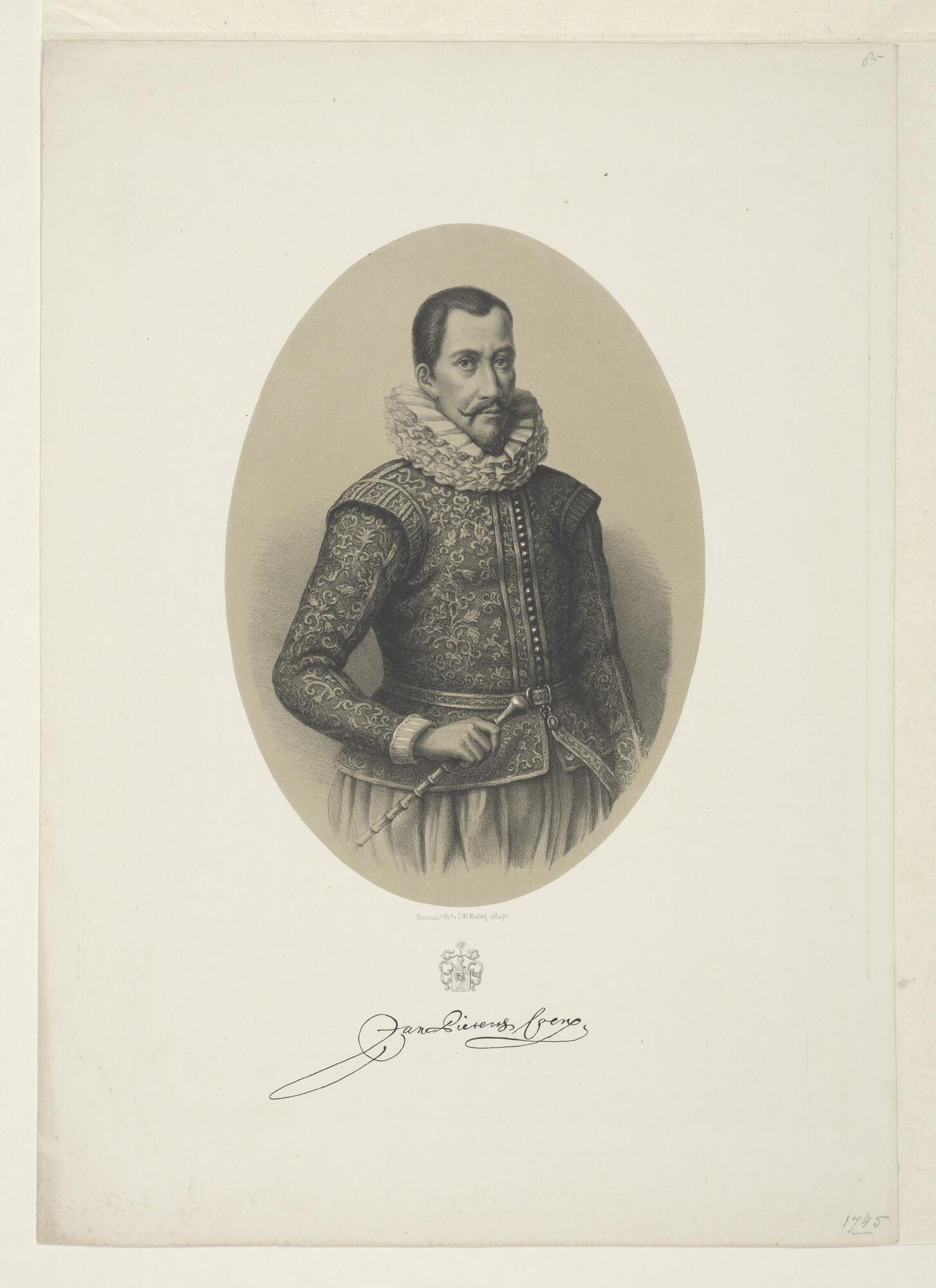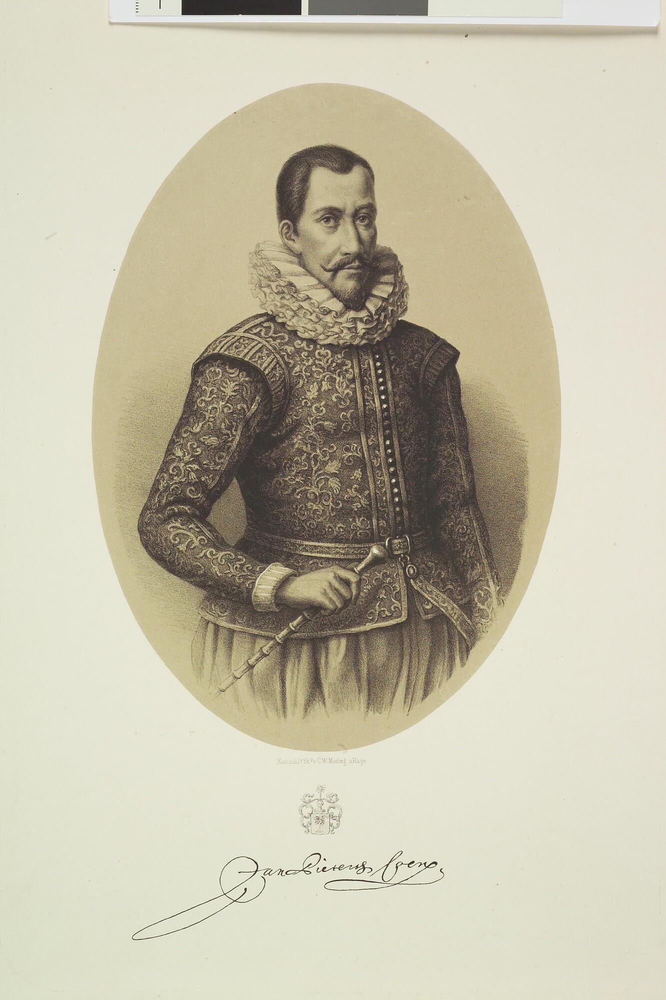 Portret van Jan Pietersz. Coen, Gouverneur-Generaal van Nederlands Indië, stichter van Batavia. Kniestuk in uniform. In ovaal.