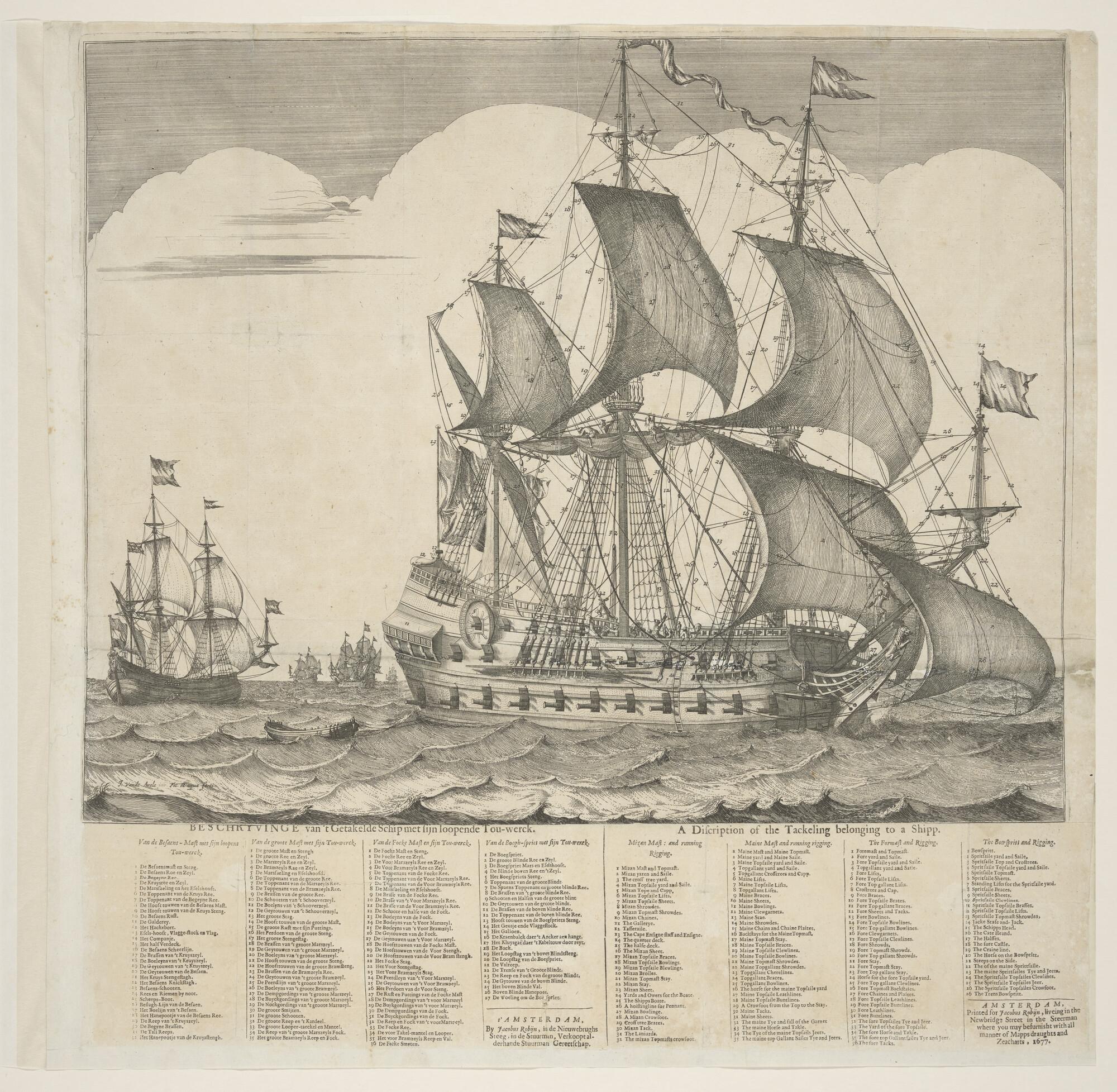 Afbeelding van een volledig getuigd schip met genummerde toelichting in acht kolommen in Nederlands en Engels.