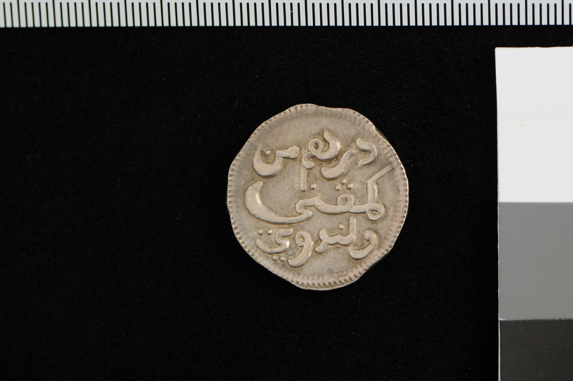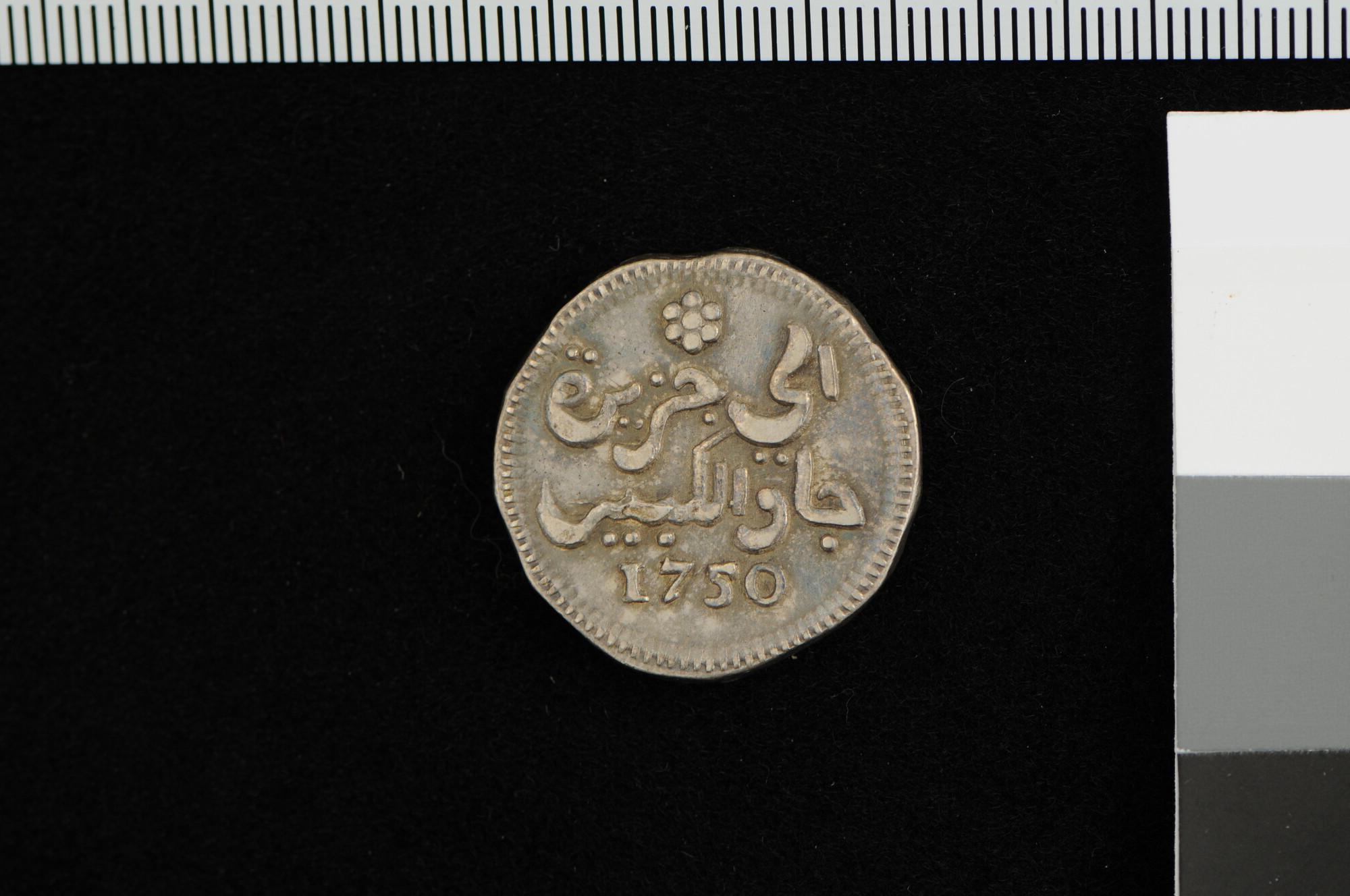 Een zilveren ropij, geslagen te Batavia, 1750. Met Arabische tekst en jaarcijfer.