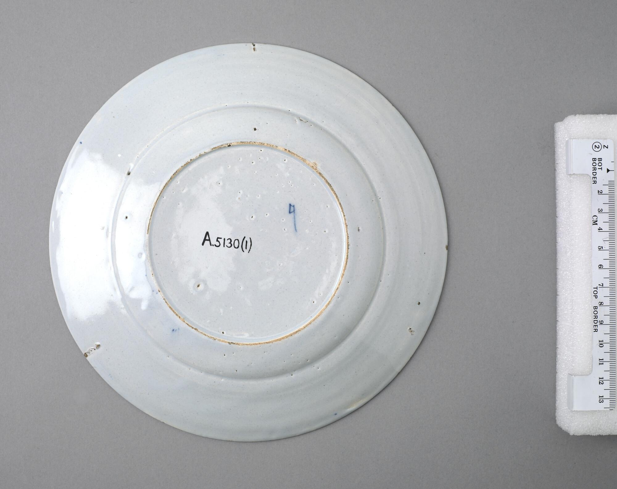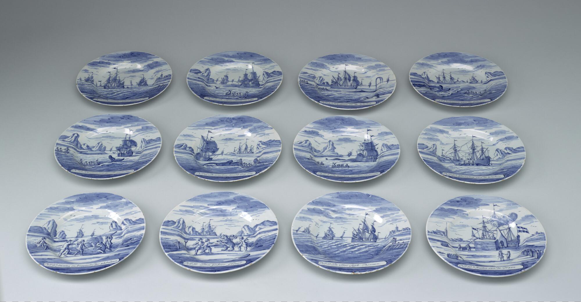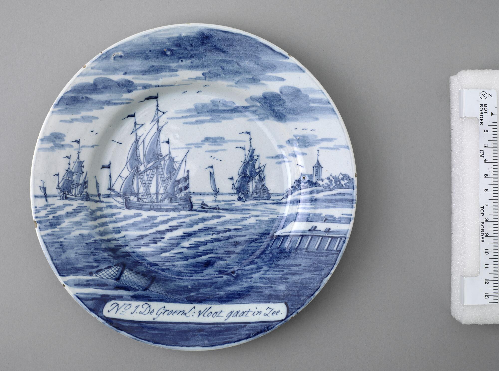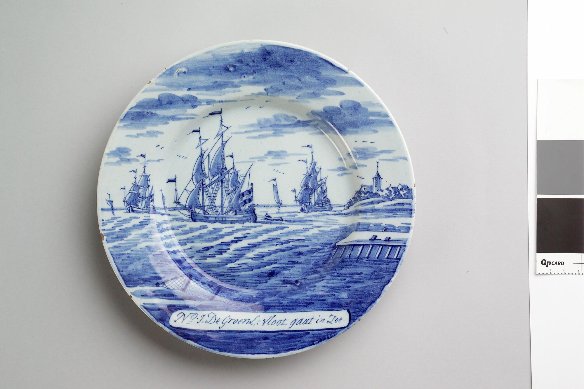 Bord van Delfts aardewerk met een voorstelling van de walvisvaart. Op de voorzijde een cartouche met een nummer en opschrift: "De Groenlandse vloot gaat in zee.".