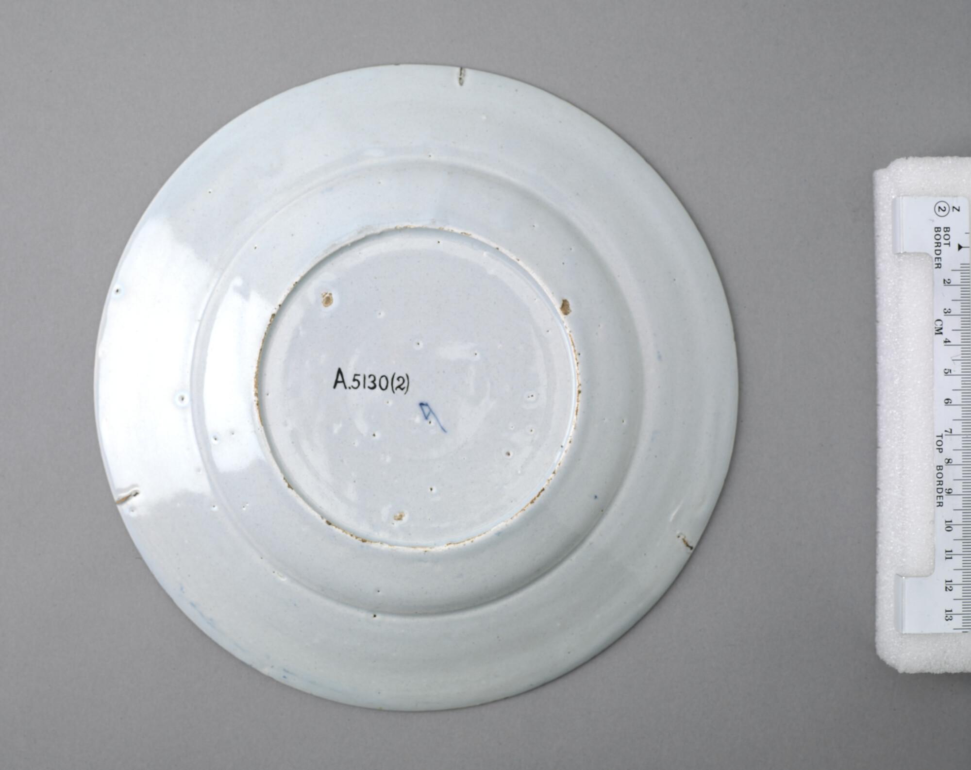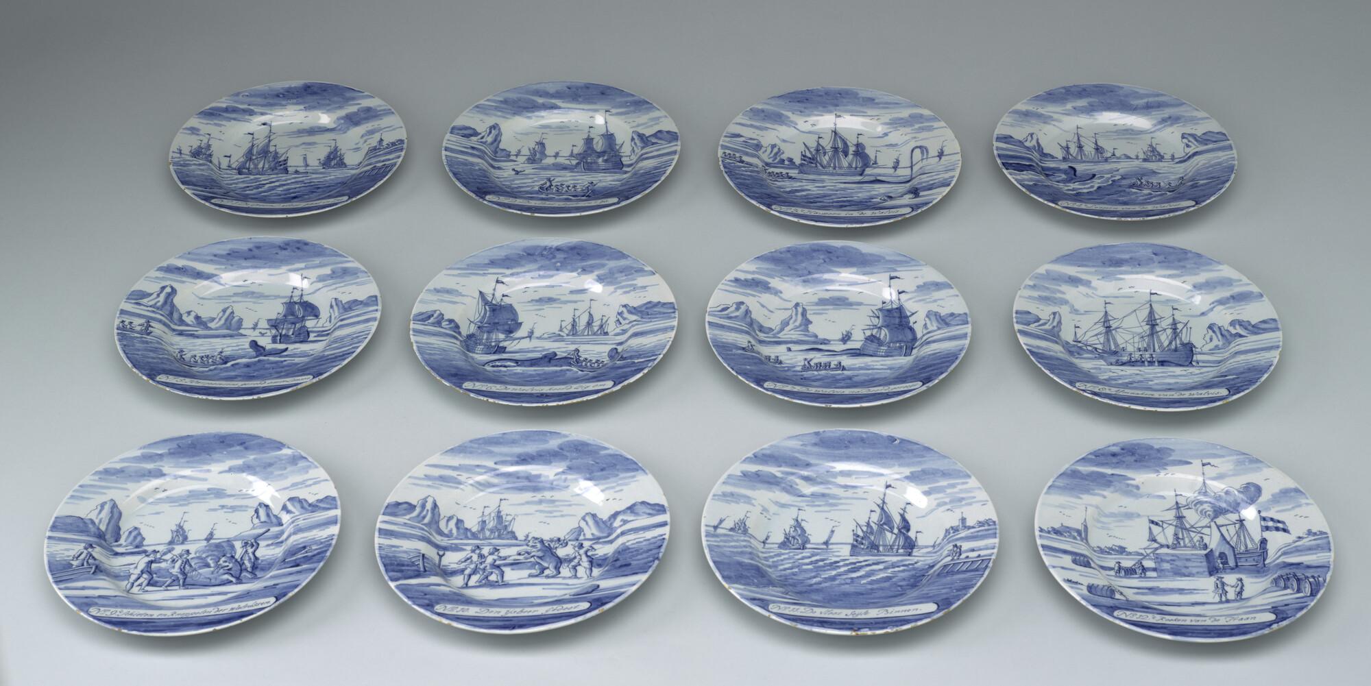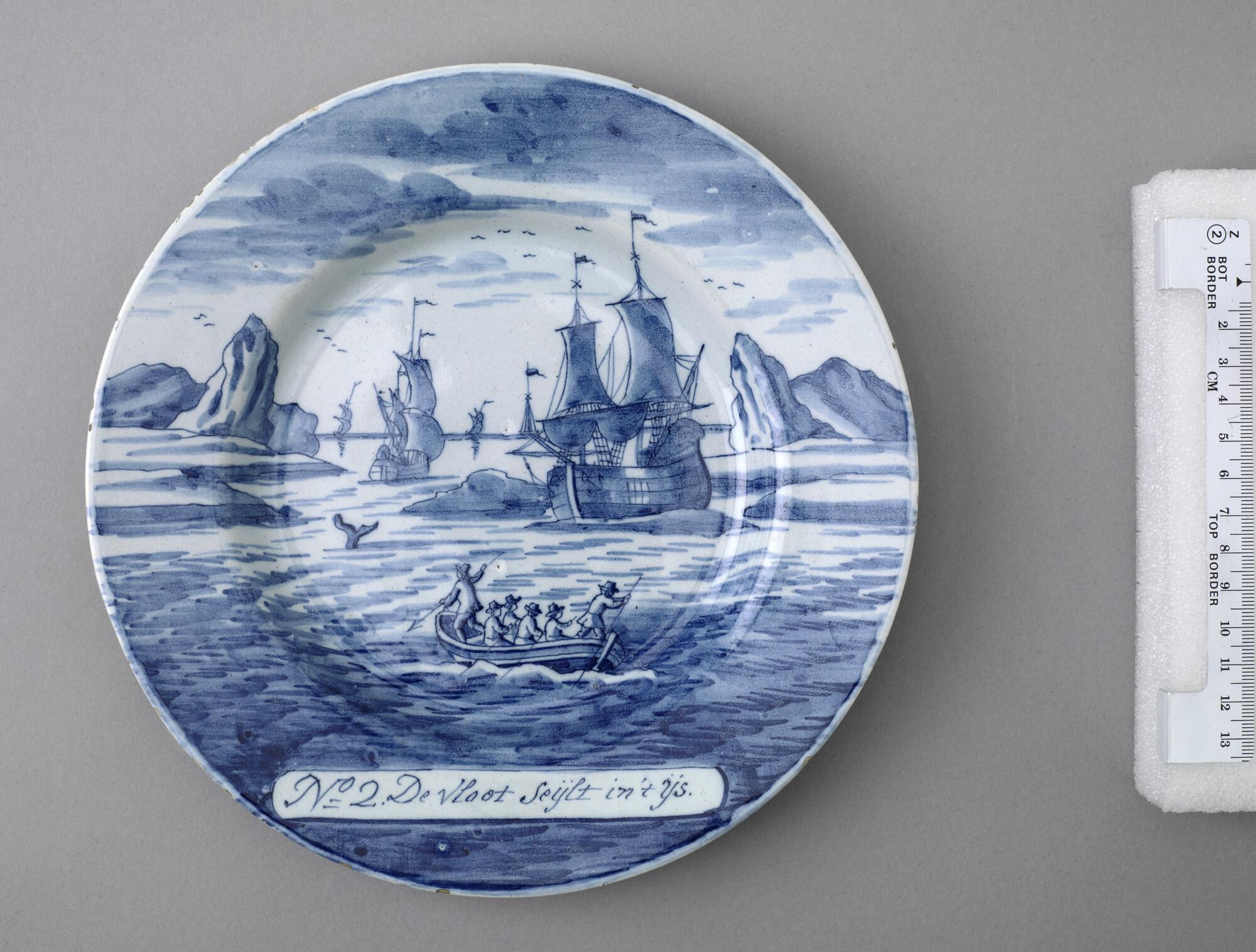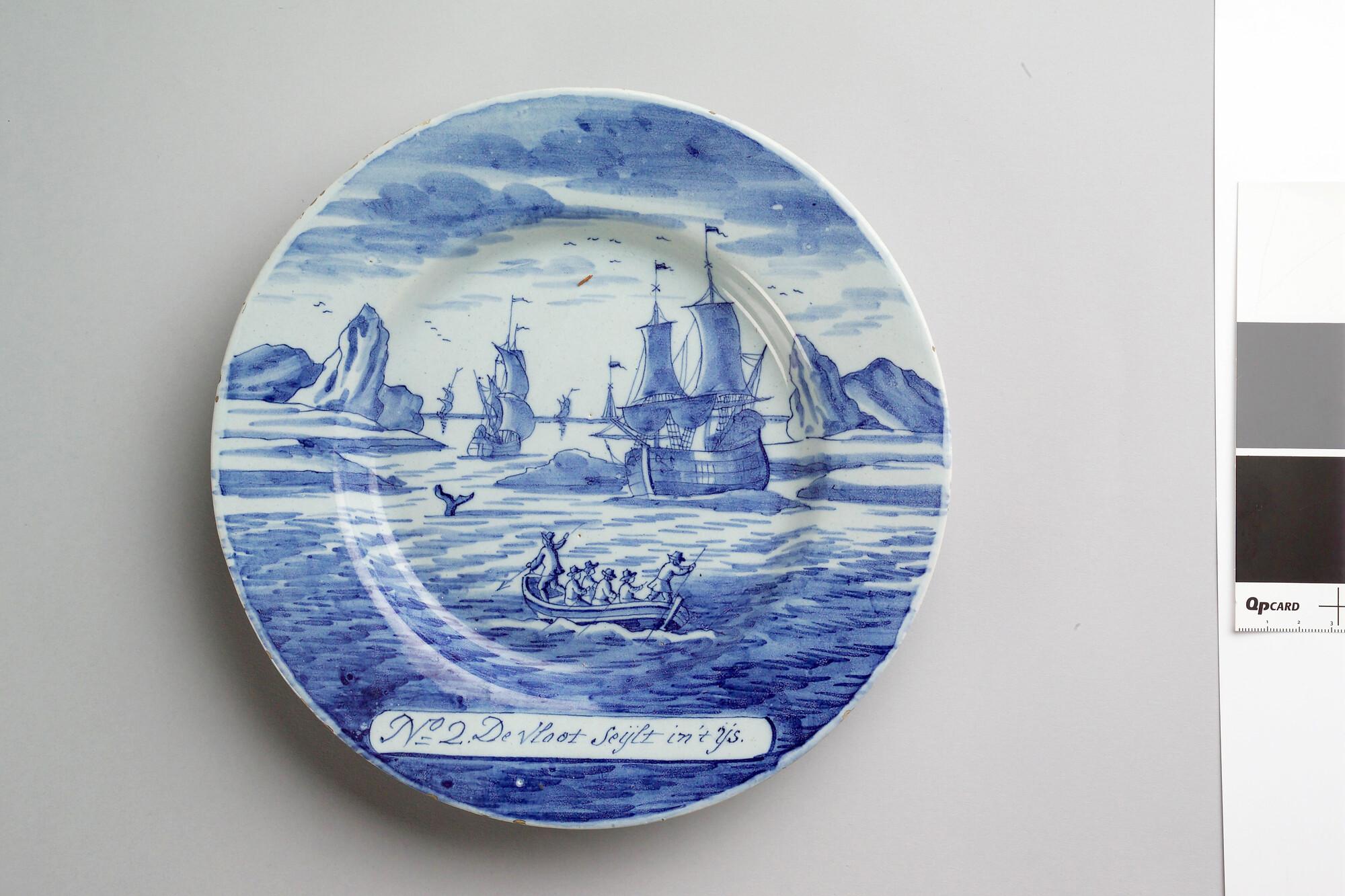 Bord van Delfts aardewerk met een voorstelling in blauw van de walvisvaart. Met op de voorzijde een cartouche met een nummer en opschrift: "De vloot seijlt in 't ijs.".